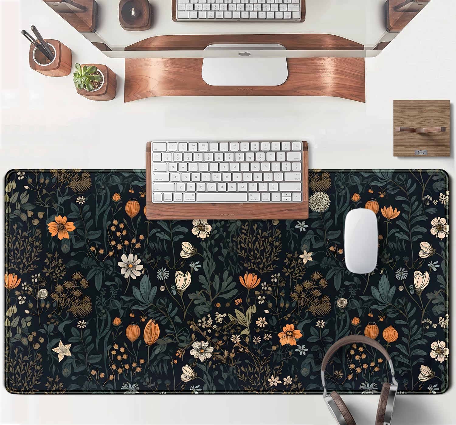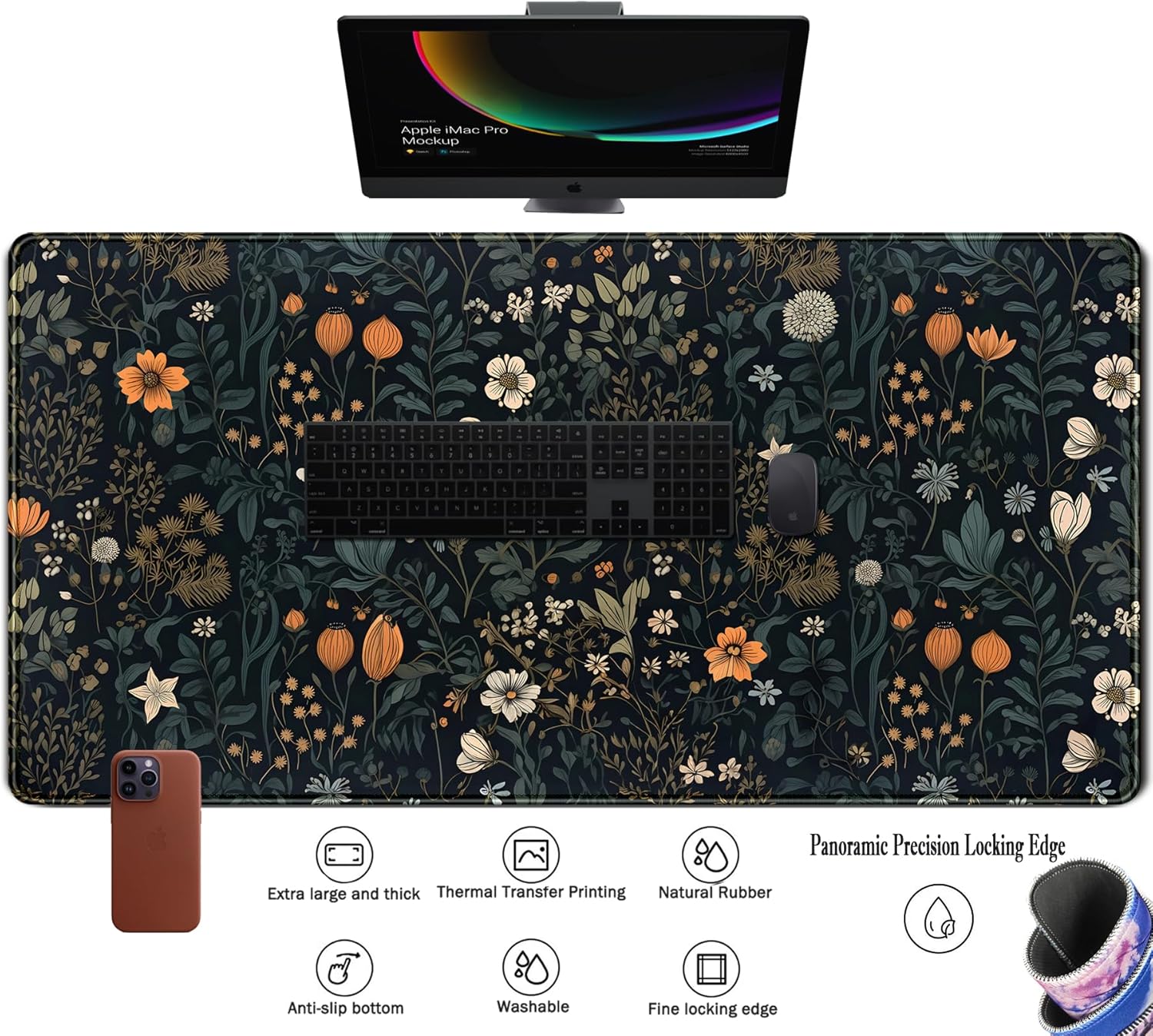 Cute Dark Floral Desk Mat Vintage Flowers Plant Mouse Pad XXL Large Extended Gaming Mousepad Women Office Decor Desk Pad, Big Laptop Computer Keyboard and Mouse Mat with Stitched Edges, 31.5x15.7 in