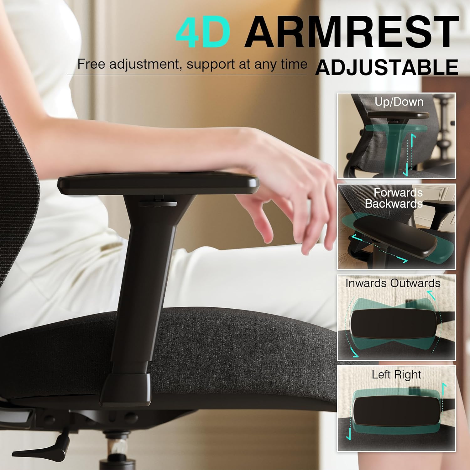T96C Ergonomic Home Office Chair, Mesh Computer Desk Chair with 4D Armrests, Adjustable Lumbar Support,Tilt Function, Executive Rolling Swivel Task Chair for Long Hours (Black - Upholstered Seat)
