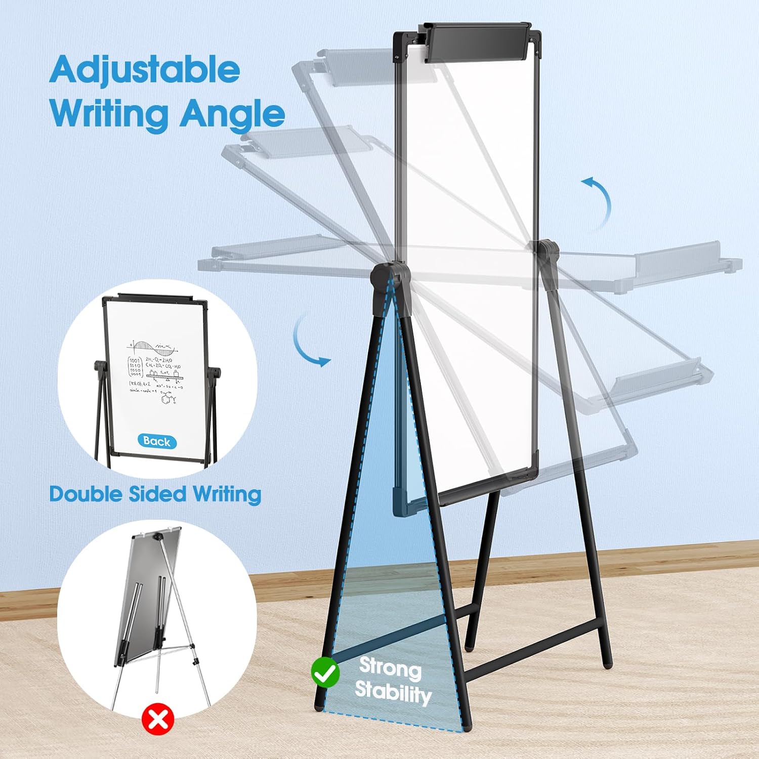 - Height & Angle Adjustable Design: Our dry erase board with stand features adjustable height and angle, catering to diverse usage scenarios. Whether sitting or standing, whether kids or adults, you can find the most comfortable height you like. Perfect for kids, students, and adults at home, school, office, or even as a standout display at the entrance of a retail store. It is a multi-purpose product that cannot be overlooked.