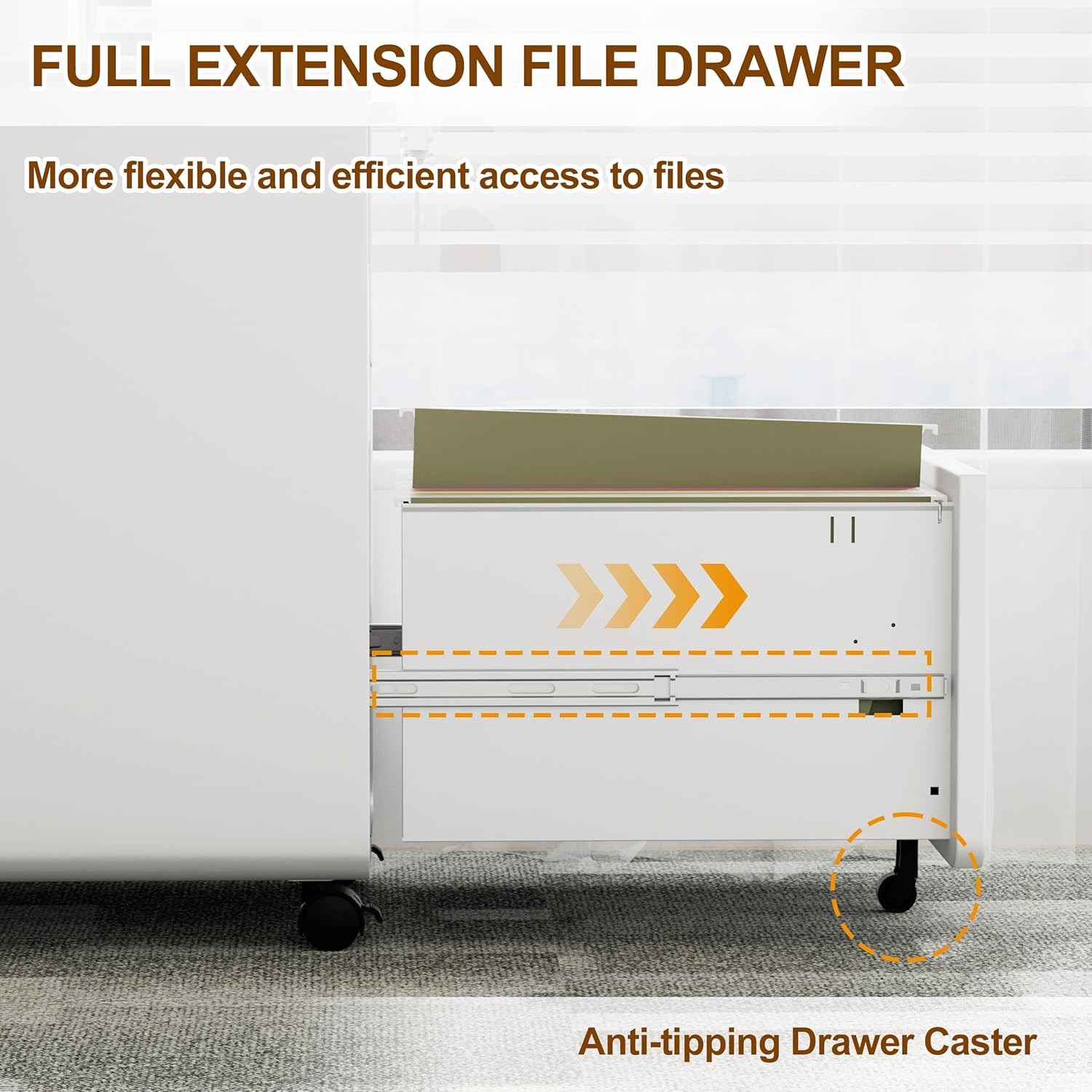 - [LVSTEEL Drawer File Cabinet]: Equipped with 2 locking casters, 2 360° swivel casters and 1 anti-tilt wheel, the cabinet can be easily moved in any direction while maintaining stability and security to prevent accidental tipping.