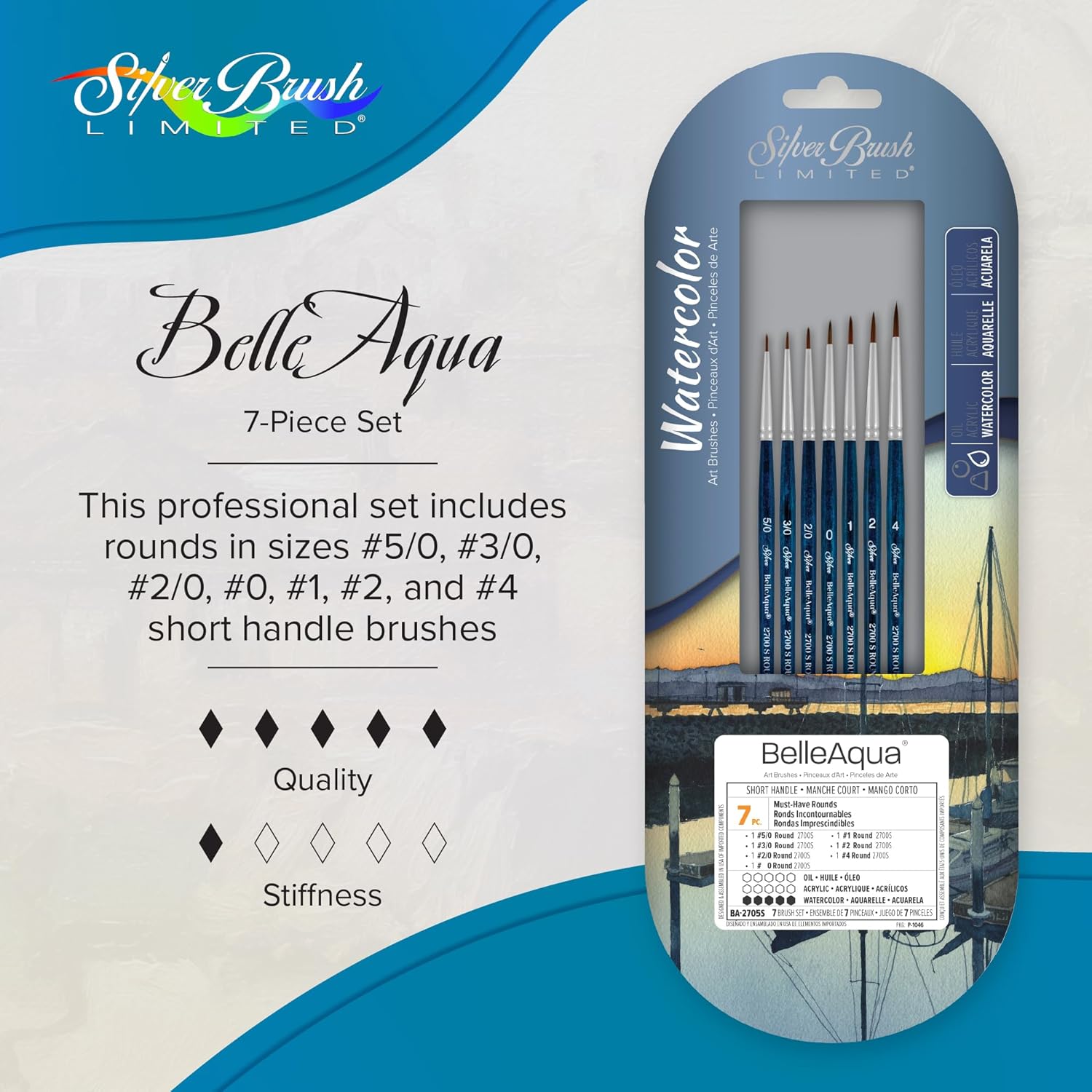 Silver Brush Limited BA-2705S BelleAqua Must-Have Rounds 7pc Round Watercolor Brush Set, Professional Soft Synthetic Red Sable Small Detail Round Paint Brush Set, Sizes 5/0, 3/0, 2/0, 0, 1, 2, and 4