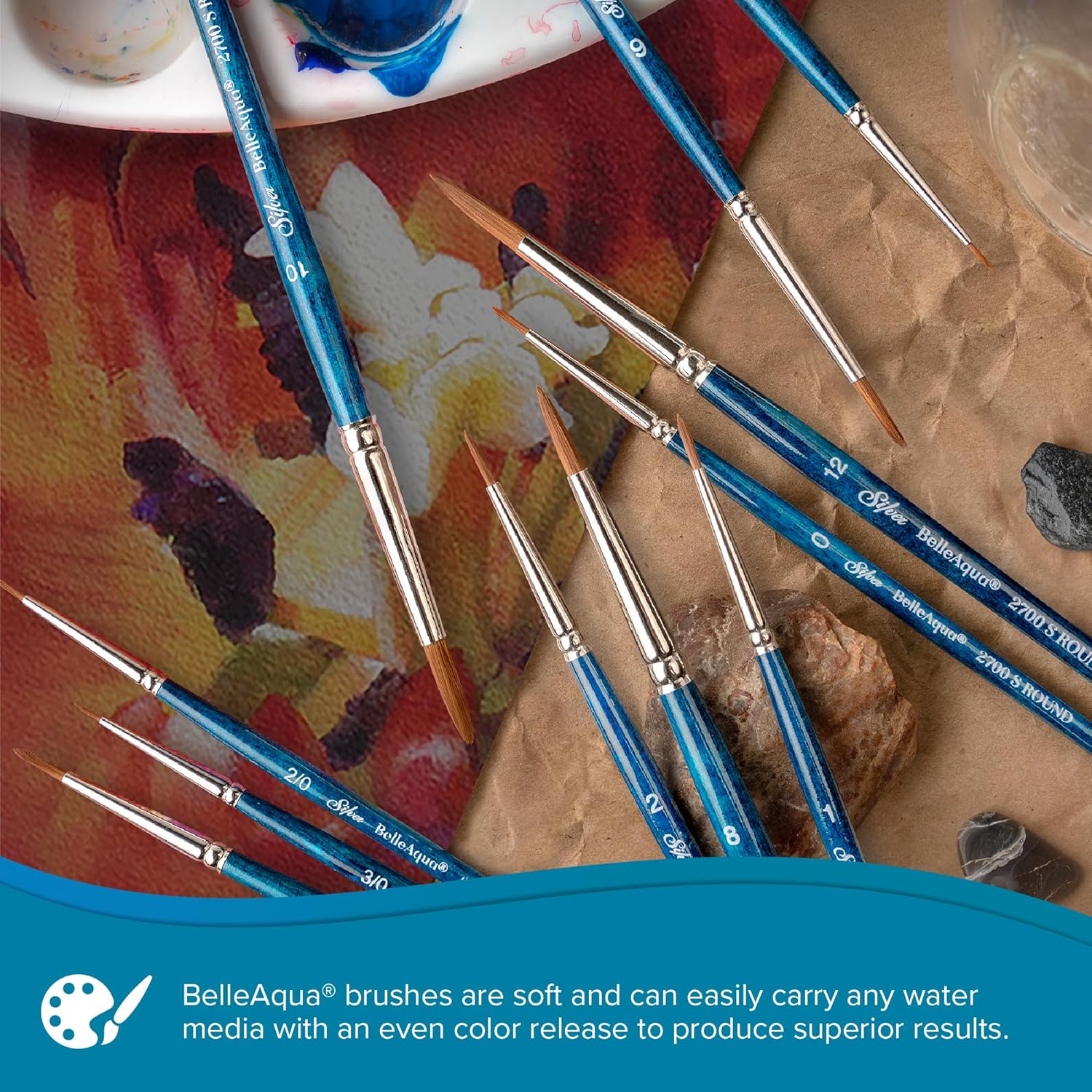 - BelleAqua: Our BelleAqua brushes were created for watercolor artists and skilled hobbyists. Each BelleAqua water color brush is soft enough to add color without disturbing previous layers but firm enough to lift color when needed. The BelleAqua is our most absorbent series, meaning it carries more color effortlessly from your watercolor palette to your painting surface so you do not have to reload often.