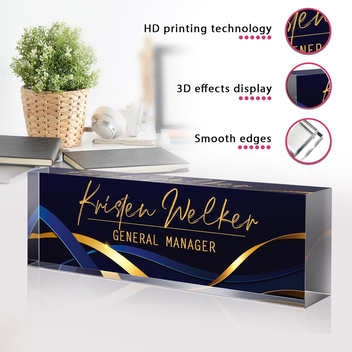 - 【Personalized Name Plate for Desk】Create a unique desk name plates in just four easy steps. We craft bespoke nameplates featuring your name and title, with options to choose your preferred style, design, and front. You can even upload your photo and logo for a truly personalized nameplate. Our talented design team is dedicated to bringing your vision to life. Elevate your office with a professional and unique nameplate that reflects your style.