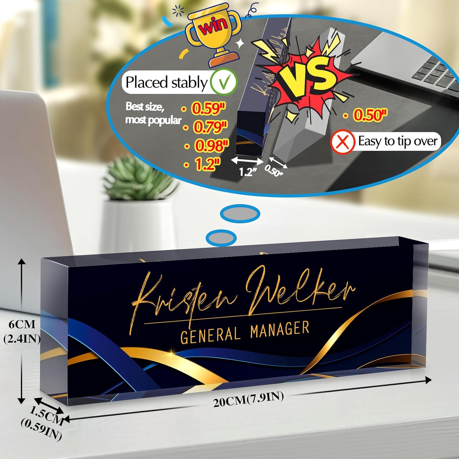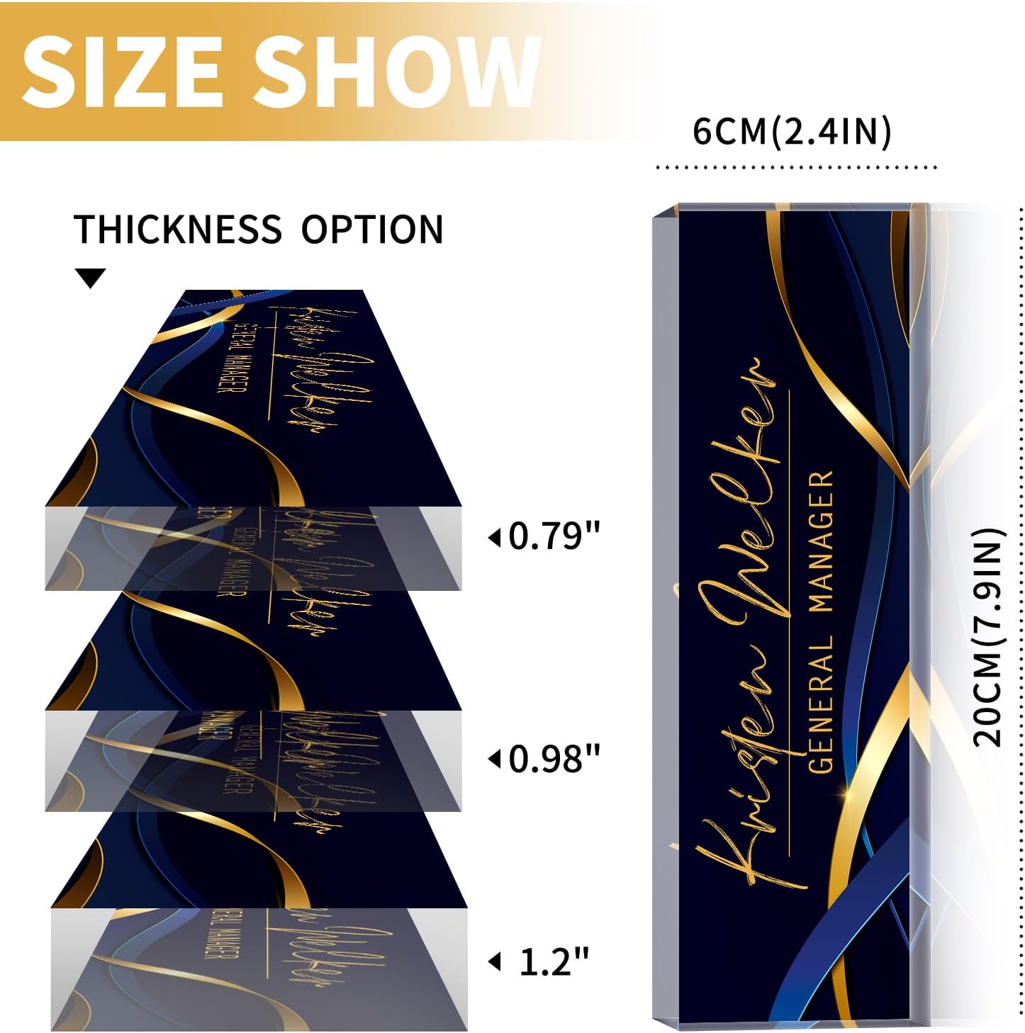 - 【Thickness upgraded to 0.79-1.18 inches】 According to market research, most people who received 0.59-inch thick acrylic nameplates would have problems with instability and easy to tip over, which would bring a terrible shopping experience. From the customer's perspective, we pause Selling a 0.59-inch nameplate, we provide 0.79-inch/0.98-inch/1.18-inch thick acrylic for selection. The 1.18-inch size is the most popular gift size, More fashionable and atmospheric, We aim to bring your vision to life!