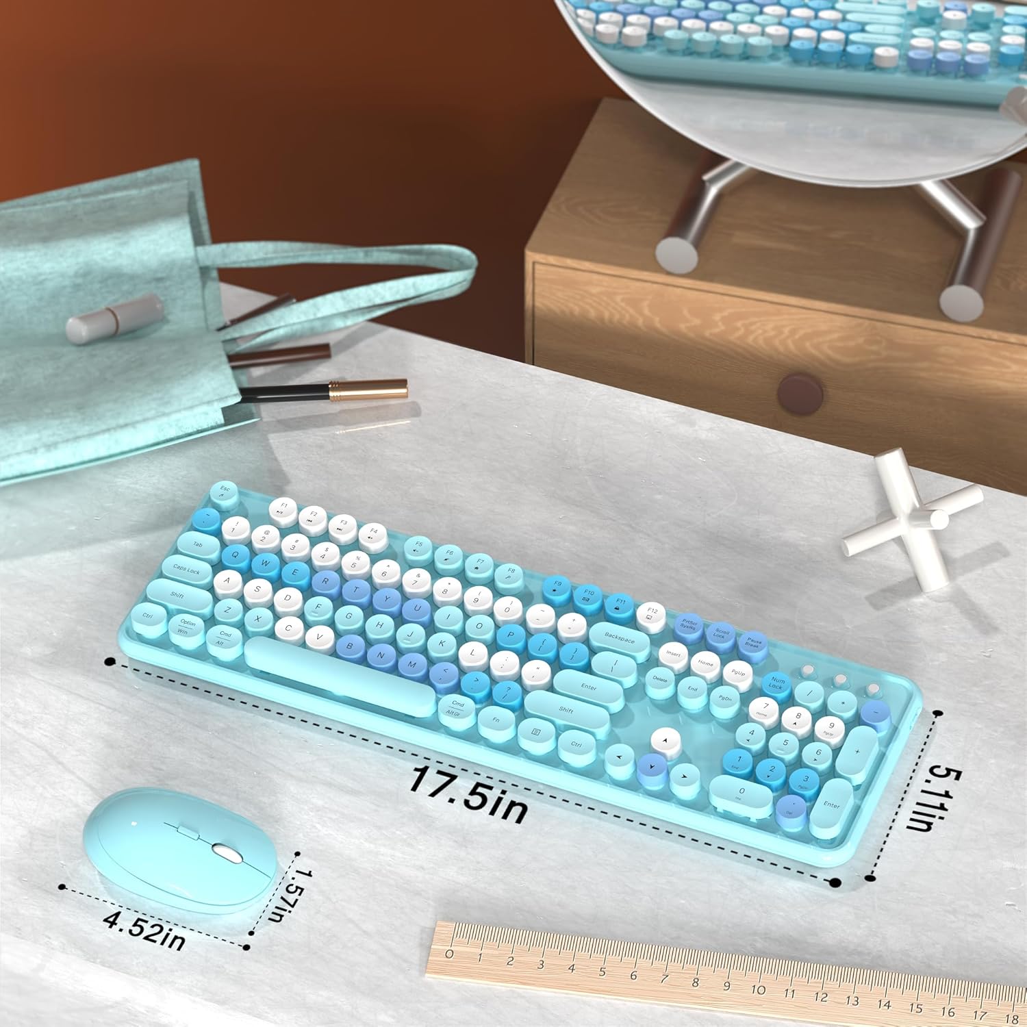 Colorful Wireless Computer Keyboard and Mouse Combo with Round Typewriter Keycaps, Retro Design, Power Switch, Ergonomic Design, 2.4GHz Wireless for Windows, Mac, PC (Blue-Colorful)