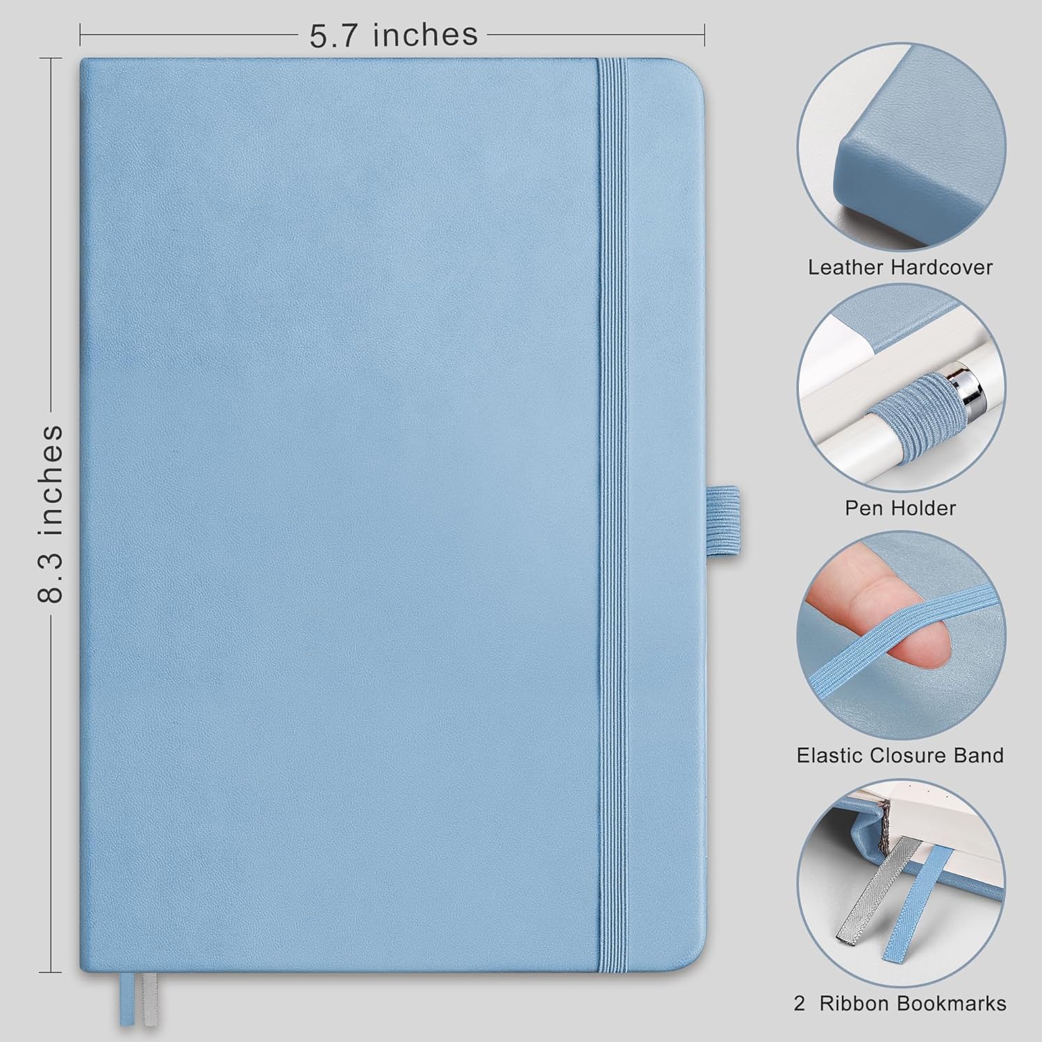 RETTACY Bullet Dotted Journal Notebook, 192 Pages, A5 Medium Size (5.7'' x 8.3''), Leather Hardcover, 100 GSM Thick Paper, for Bullet Journaling, Planning, Tracking (Light Blue)