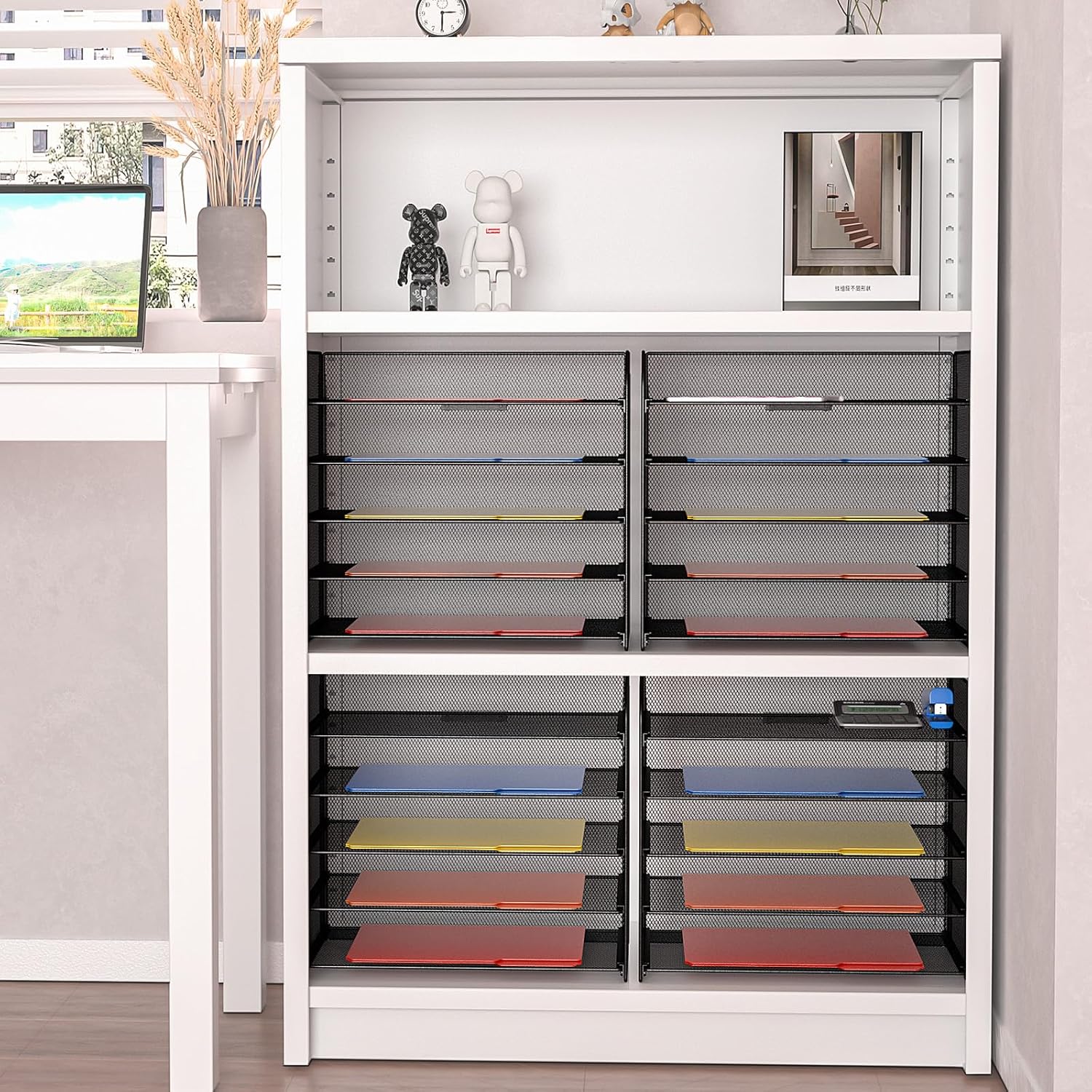 - Legal size paper tray organizer is made of sturdy steel frame,making it more stronger,more stable and durable,mesh panel prevents things falling off the shelf.