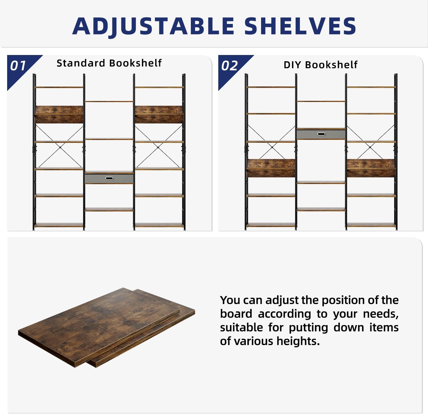 NUMENN Bookcases and Bookshelves Triple Wide 6 Tier Bookshelf, Large Etagere Bookshelf with Storage Drawer, Adjustable Open Display Shelves for Living Room Bedroom Home Office, Vintage