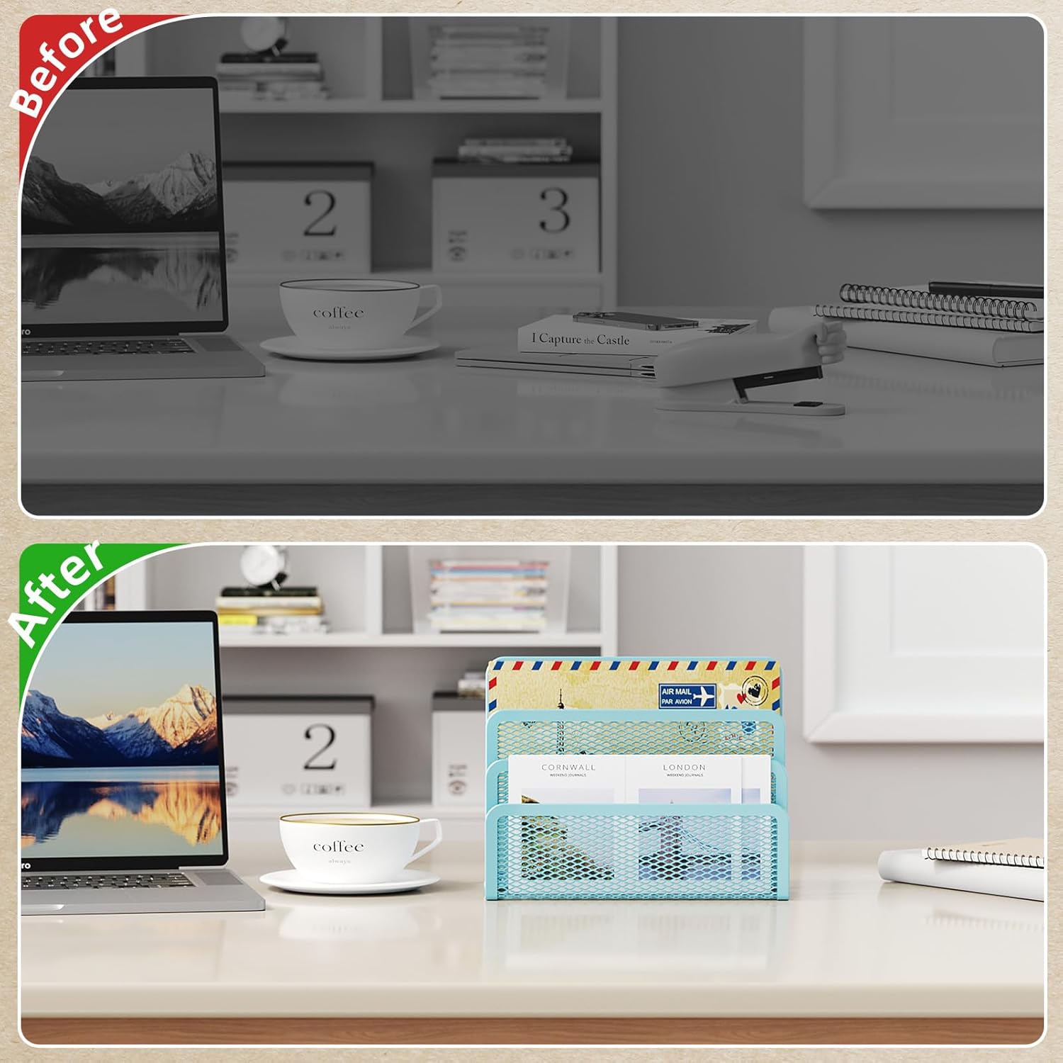 Marbrasse Mail Organizer for Desk, 3-Slot Mesh Metal Mail Holder countertop, Letter Holder, Office Desktop Envelope and Document Storage Rack (Blue)