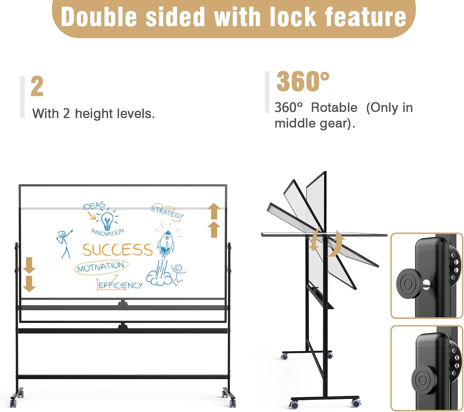 - 🌟 ✔ 【360-Degree Rotation】 Maximize your writing space with this double-sided magnetic dry-erase board. It offers 360-degree writing capability (rotation is operational only in the middle position). The smooth rotation paired with a top-quality locking mechanism ensures easy use and security.