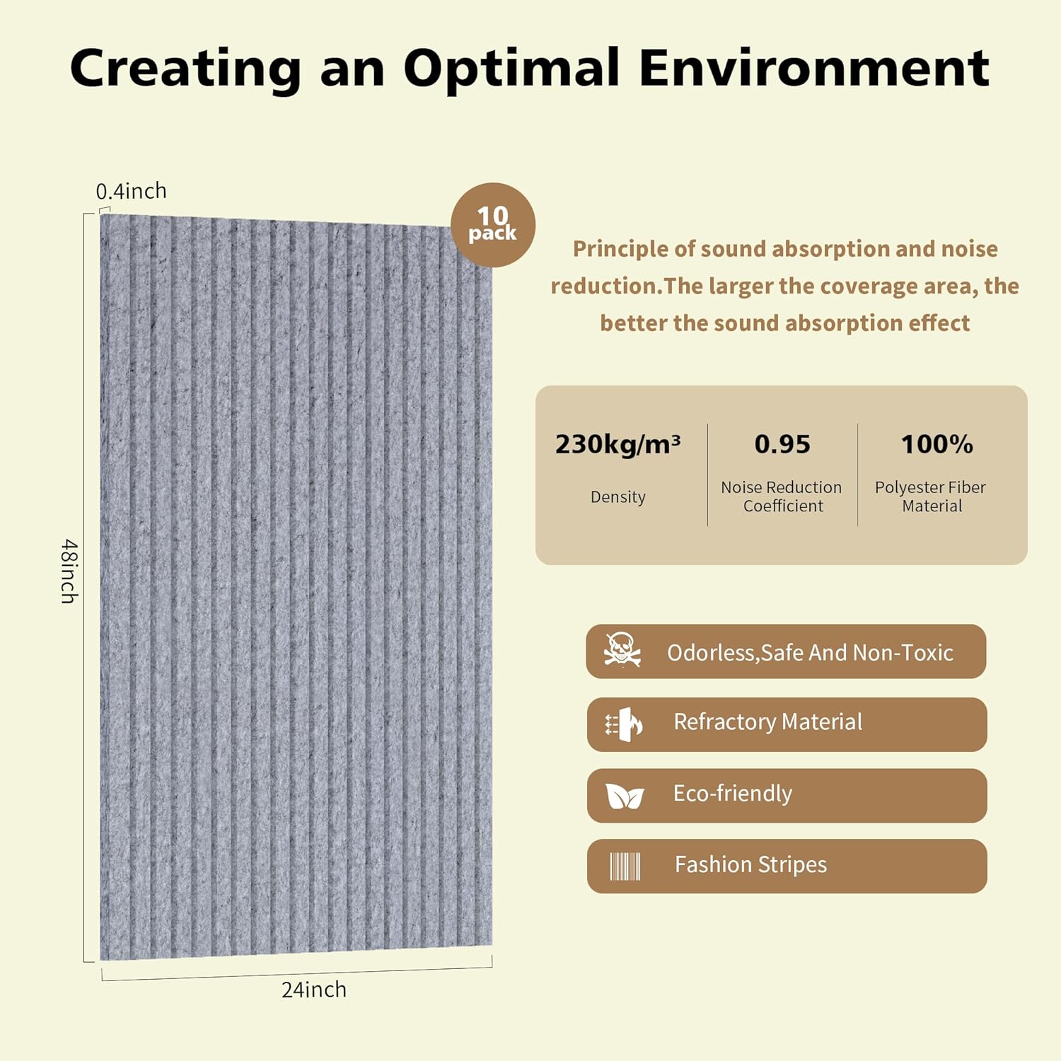 - STYLISH DECORATIVE: The noise dampening panels feature a creative slotted design and offer a wide range of colors to choose from, which can perfectly match your unique style and interior decor. Acoustic panel can be easily cut into different shapes for DIY wall art. Our soundproof wall panels use felt laminating technology to present vertical stripes in the form of large acoustic panels, which absorb unwanted sound and at the same time serve well as a decorative wall surface.