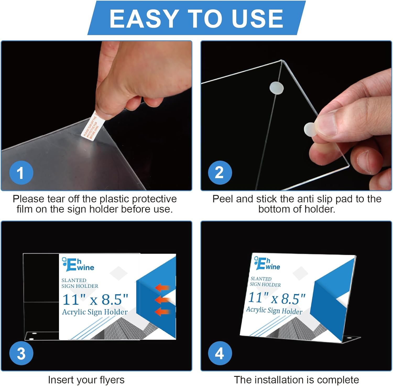 - Easy to Use: Insert 4 anti-slip pads into the base, Each of our Acrylic Sign Holder comes with a peel off film guide, follow the red arrows to peel off the film in seconds, and the plastic sign holder has an opening on its side for easy paper insertion