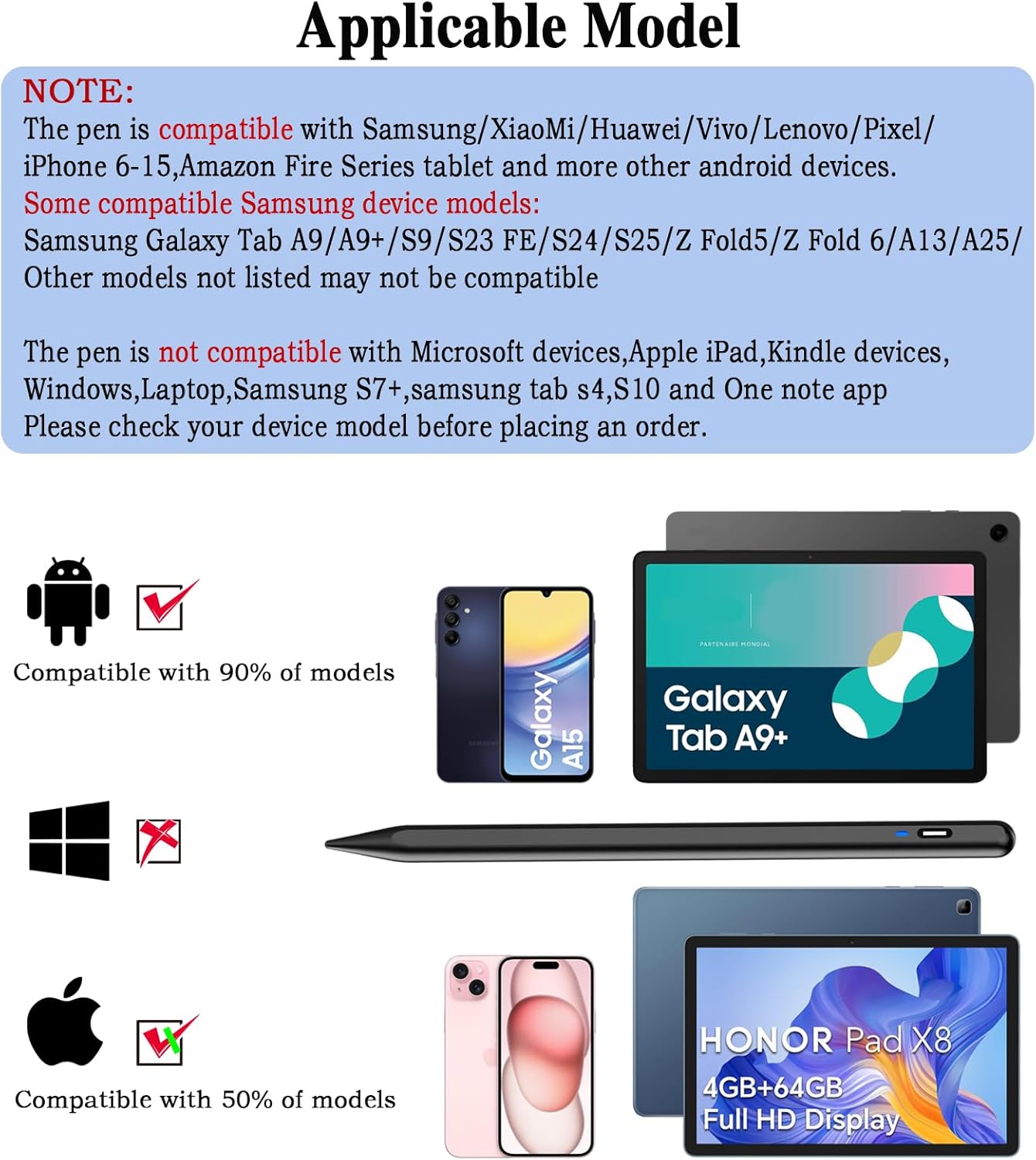 - ăWide Compatibilityă-This stylus pen for touchscreen is universal for capacitive screen electronic products and is specially designed for Android device on the market.The iphone stylus pen is suit with Samsung/XiaoMi/Huawei/Vivo/Lenovo/Pixel/iPhone 6-15 ,Amazon Fire Series tablet and more other android devices. Some compatible Samsung device models-Samsung Galaxy Tab A9/A9+/S9/S23 FE/S24/S25/Z Fold5/Z Fold 6/A13 /A25/ (Note: This lenovo pen is not compatible with Microsoft devices,Apple iPad,Kindle devices,Windows,Laptop,Samsung S7+,samsung tab s4,S10 and One note app. Please check your device model before placing an order.