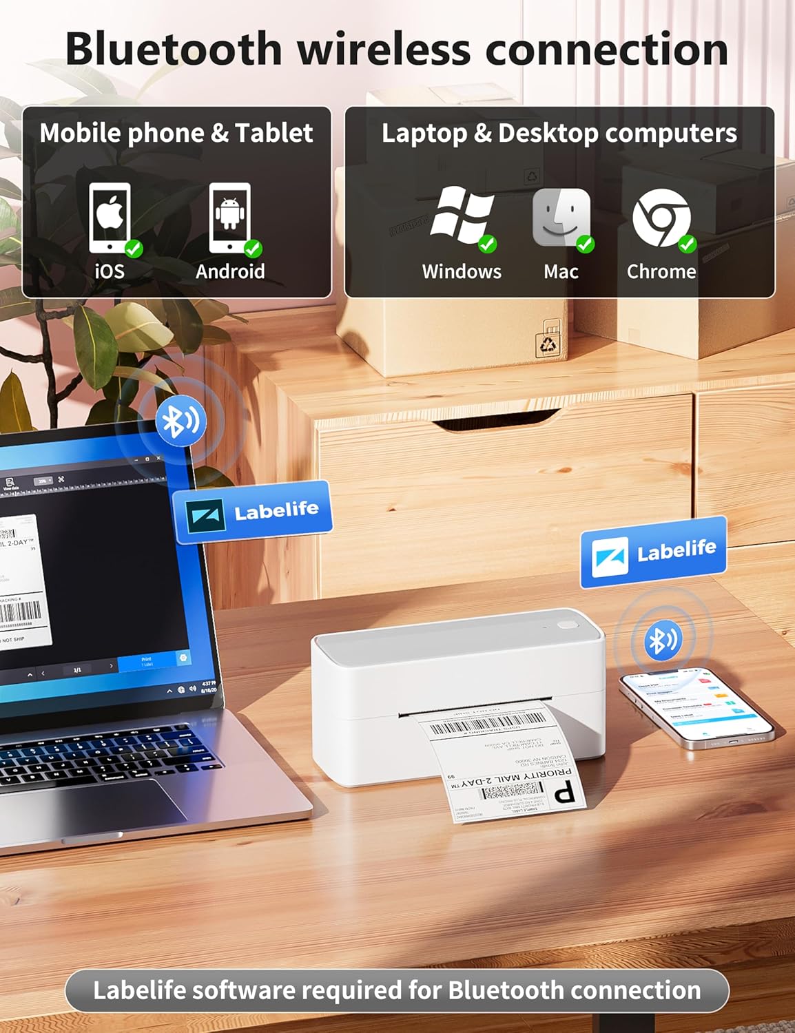 - [Print Wirelessly] - Phomemo bluetooth shipping label printer supports wireless printing through bluetooth connection. For IOS and Android, need to download the "labelife " APP from Apple Store or Google Play. With easy and simple operations, you can easily print your documents, photos, and more, making your life more convenient! Note: All devices cannot be directly connected to Bluetooth and need to be used through the app