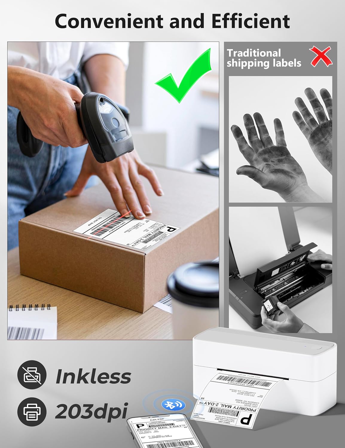 - [Various Platforms Compatibility] - This shipping label printer can support the width of 1 - 4.6 inches labels, which is widely used to print labels from major sales and shipping platforms, such as eBay, Shopify, Amazon, Etsy, Poshmark, UPS, USPS, FedEx, ShipStation, DHL, Shippo. One-click use: text, pictures, barcodes, QR codes, Form, Thanks cards, hundreds of icons, and many pre-made templates for commercial and home use. Improve your efficiency. Also a gift for your friends and family