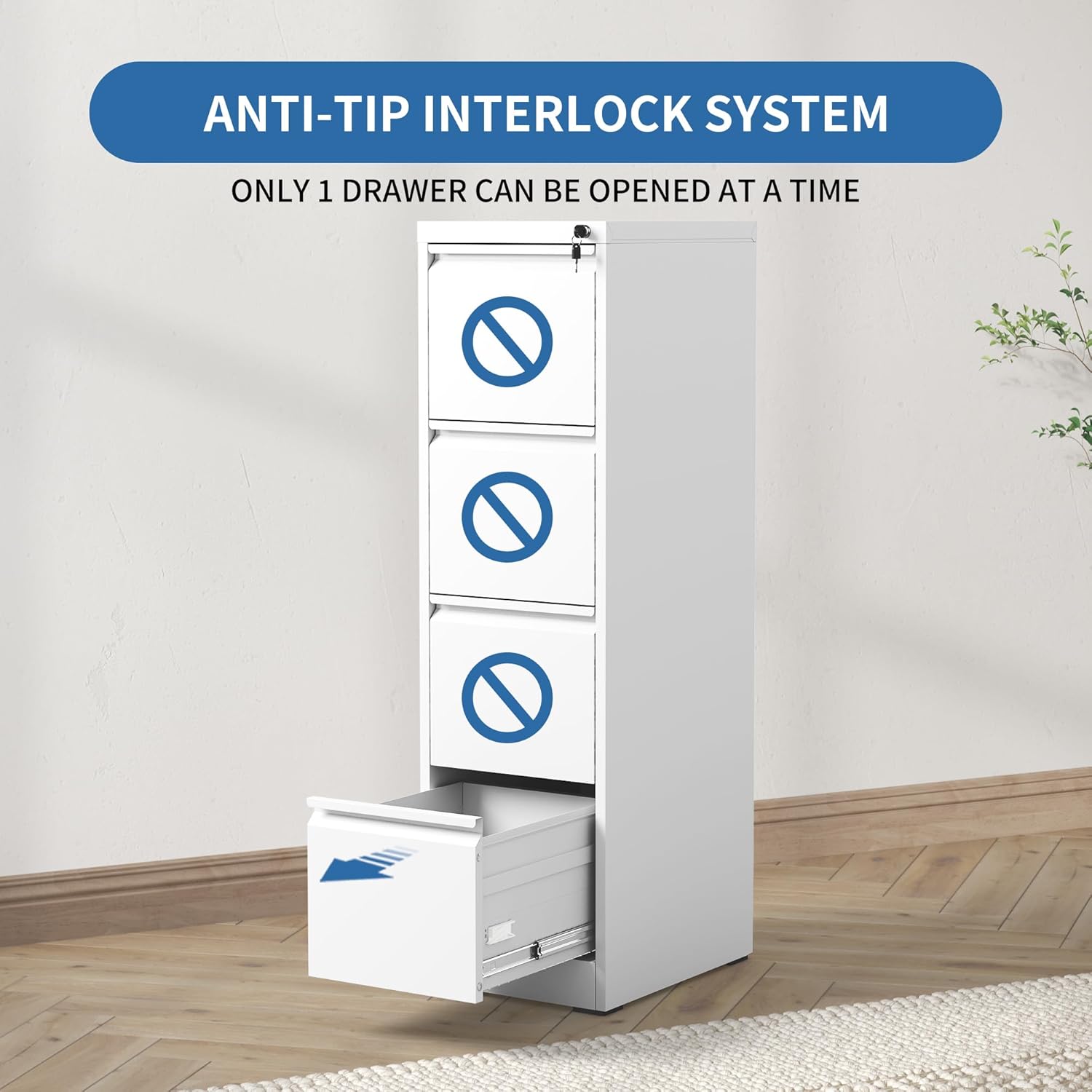 - ăSecure & Anti-tilt DesignăOur office filing cabinets with 4 drawer feature a locking mechanism and anti-tip feature. When one drawer is opened, the interlocking drawer system prevents the other drawers from opening, preventing tip-overs and increasing safety.