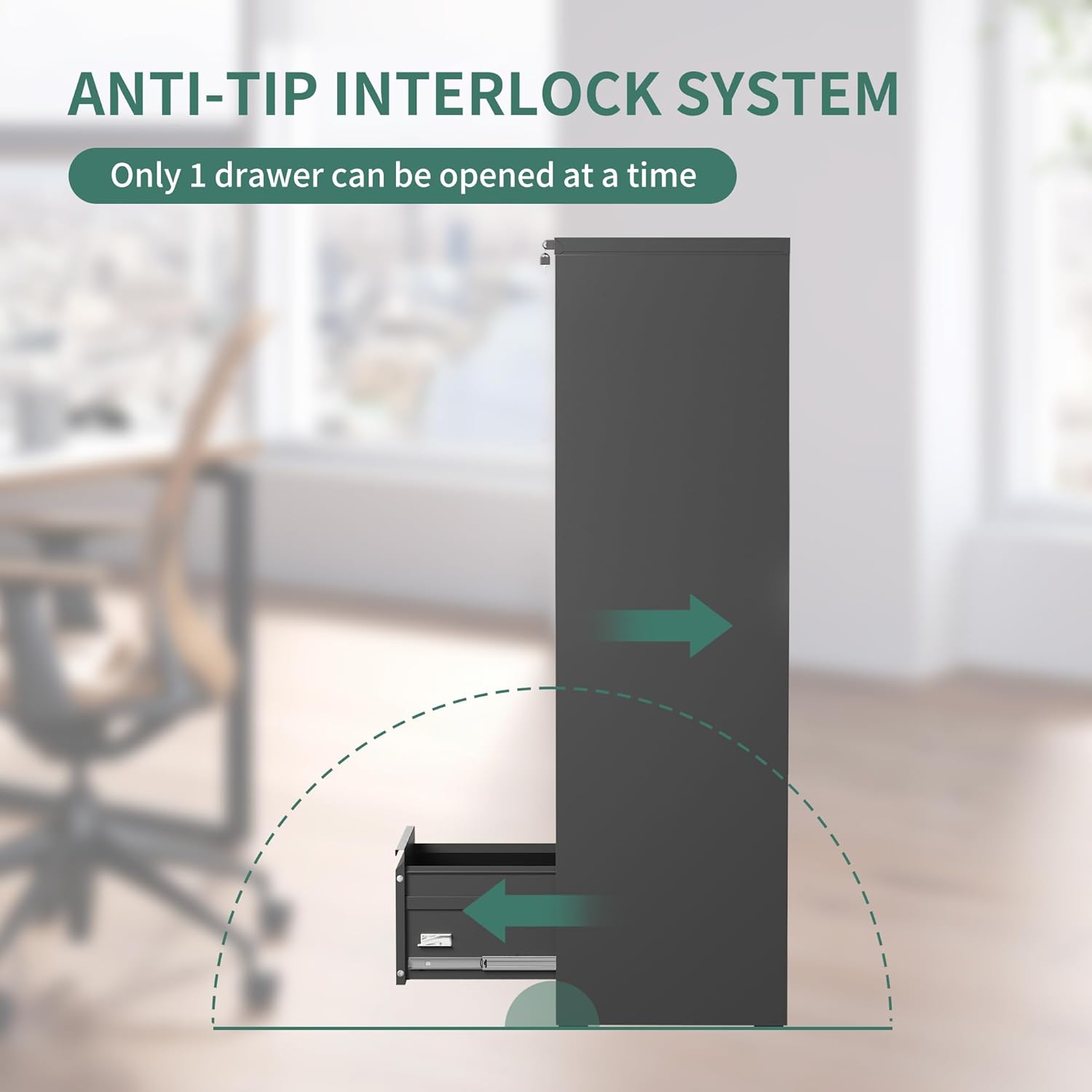 - ăSecure & Anti-tilt DesignăOur office filing cabinets with 5 drawer feature a locking mechanism and anti-tip feature. When one drawer is opened, the interlocking drawer system prevents the other drawers from opening, preventing tip-overs and increasing safety.