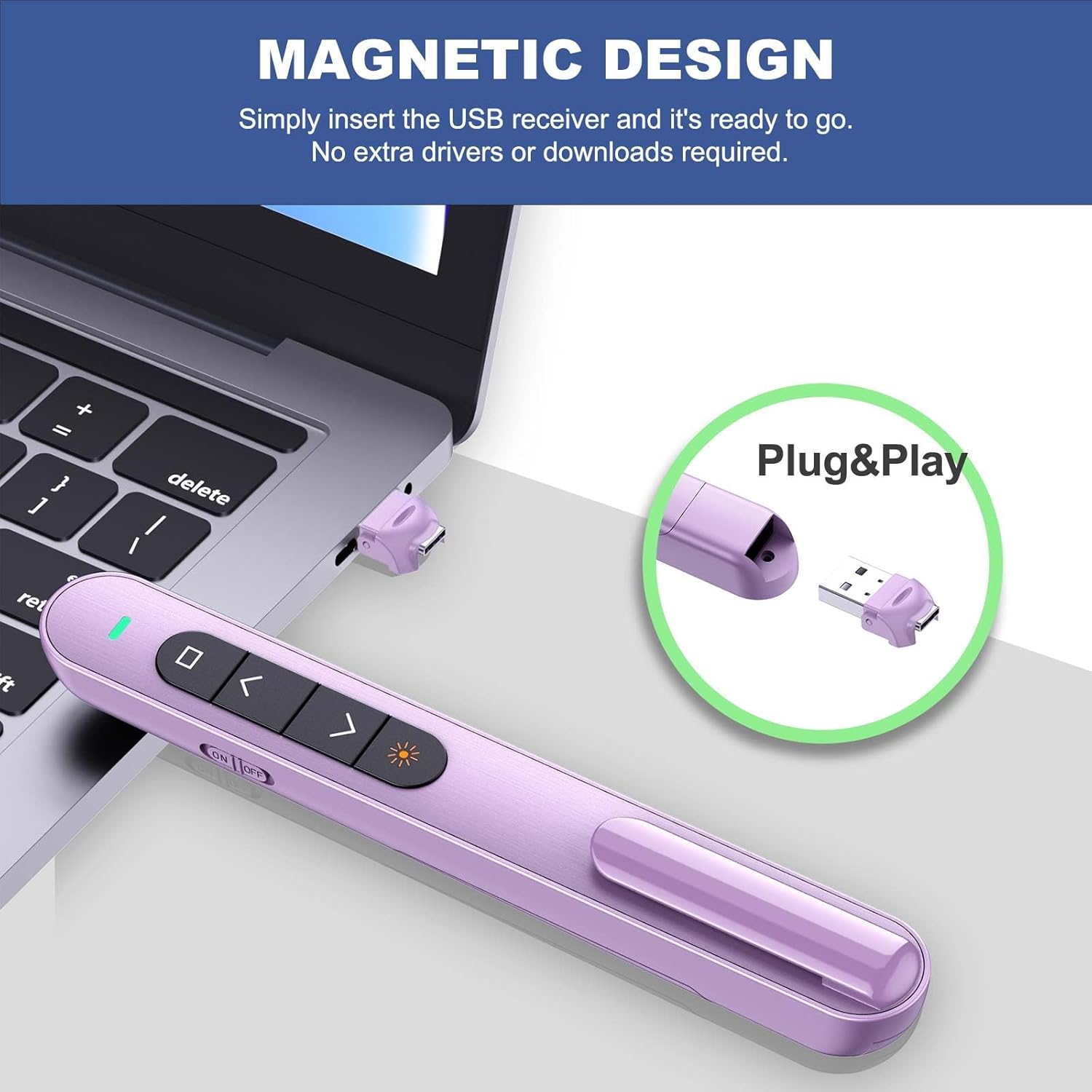 - ăPLUG & PLAY PRESENTATION CLICKERăThe intuitive touch buttons of this presenter clicker integrate hyperlink navigation, page up/down, volume control, power switch, and full screen/black screen functions. No software is required, just connect the magnetic 2.4 GHz USB receiver at the bottom of the clicker to your computer and it's ready to use. (Powered by 1 AAA Battery is not included)