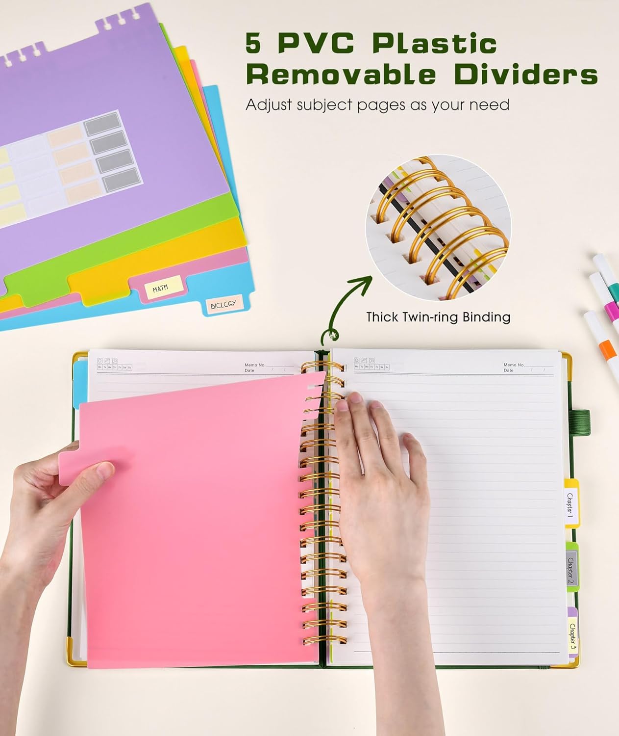 - 【5 Adjustable Dividers with 8 Tabs】Our 5 subject notebook include 5 removable plastic dividers, flexible and durable so you can move and organize them as your wish. It can be divided into 5 sections in total, which had enough features to keep organized on different subjects, instead of piles of random spiral notebooks that will slimmed your backpack down a ton! Come with 8 self-adhesive labels that separate information and make it easy to find categories to help organize your notes effectively.