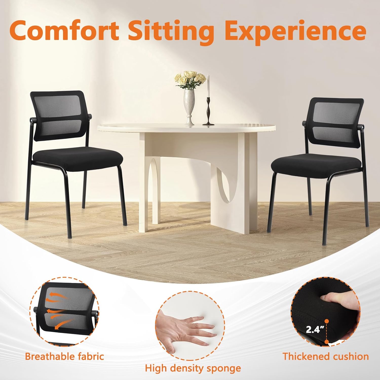 - ăVersatile and StylishăThe sleek and modern design of the black reception chair adds elegance to any space and is perfect for professional environments such as conference rooms, lobby, waiting rooms, receptions, restaurants and clinics. The armless feature makes it easy to move around and versatile in offices, schools and educational institutions.