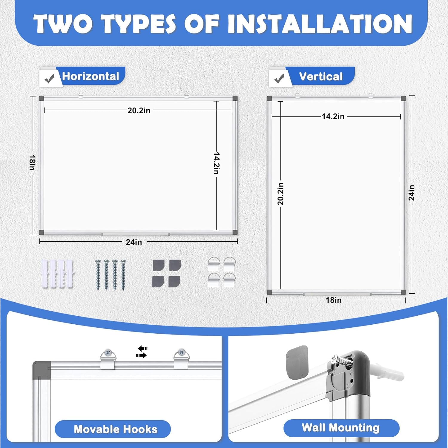 - 【Durable & Lightweight】WALGLASS Magnetic white board with aluminum frame is solidly builted, portable white board is lightweight enough to be held by tacks, which can be easily hanged on the wall horizontally and vertically as you like with 5 movable hanging hooks.