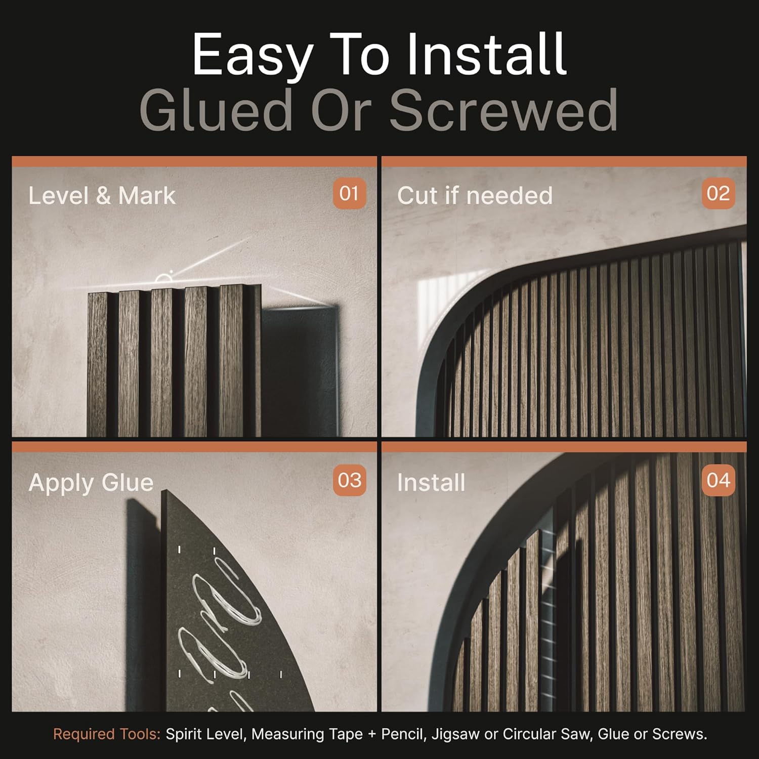 - Easy installation: Enjoy a hassle-free setup process that allows you to quickly elevate your wall decor without the need for professional assistance. You can install each wood slat wall panel using glue or screws.