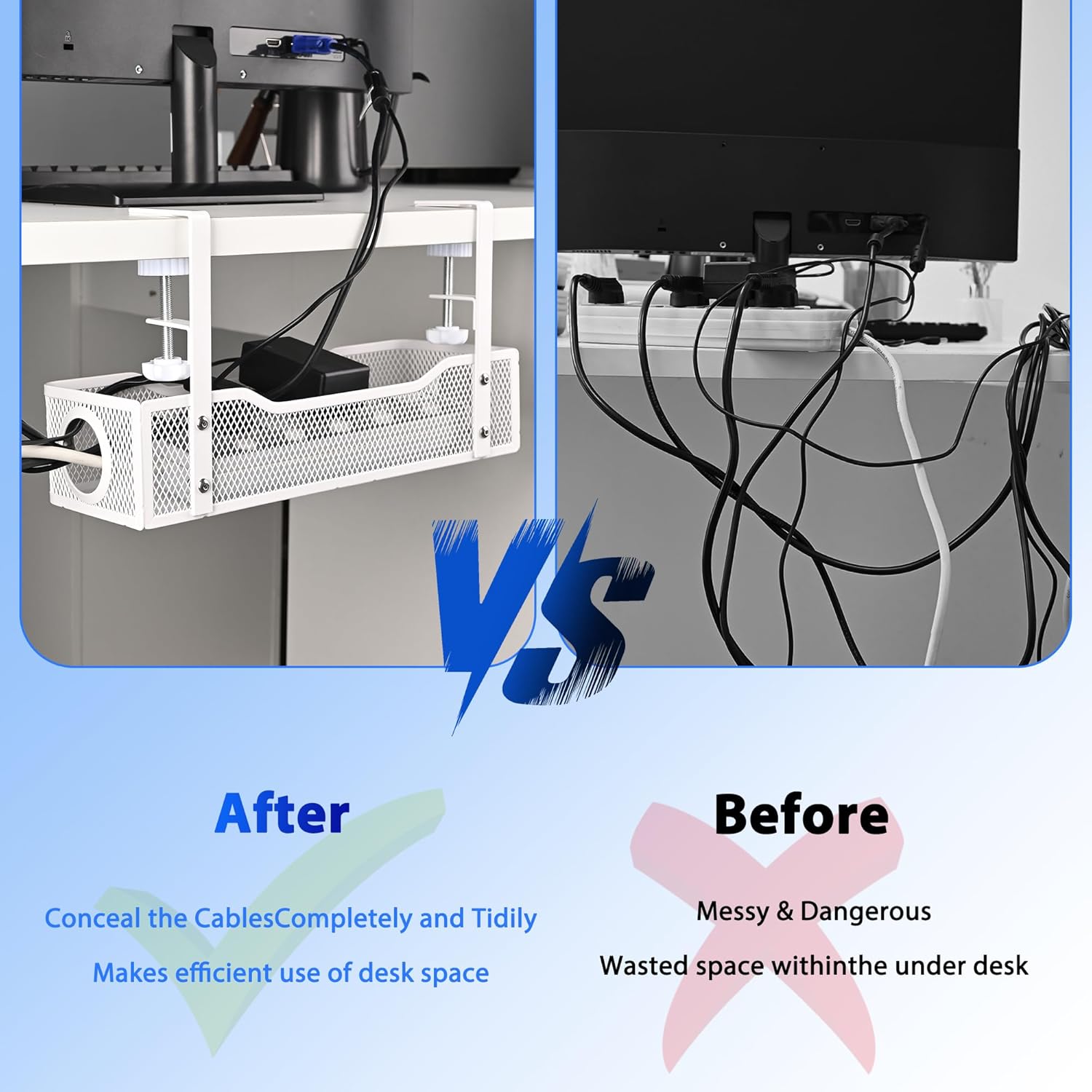 - What You Get – Complete Cable Management Solution - With your purchase, you’ll receive 1 high-quality metal cable management tray, durable clamp mounts, and an easy-to-follow user guide for quick installation. This all-in-one desk cable management solution helps you create a clean, organized desk setup in no time, improving your workspace’s functionality and aesthetics.