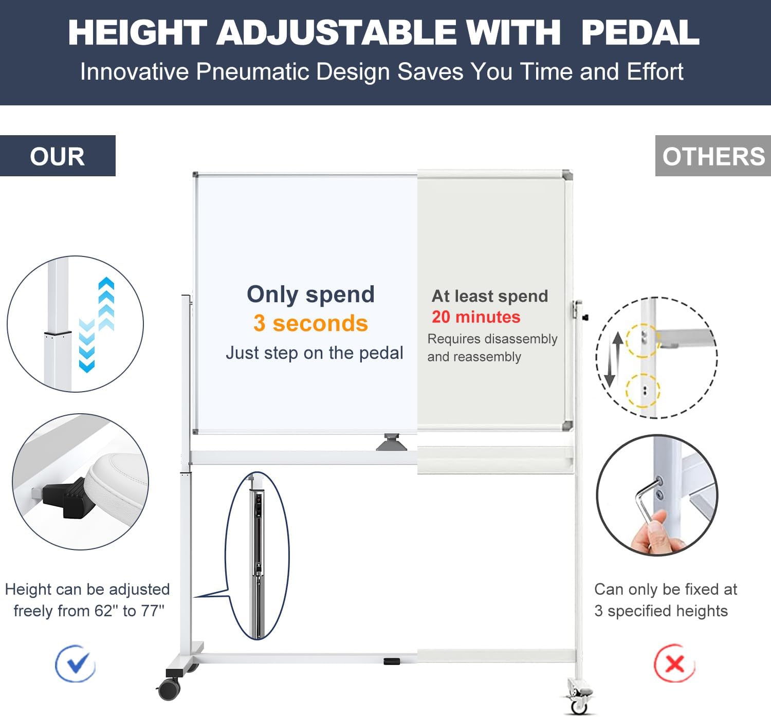 - EASIER HEIGHT ADJUSTMENT - With your foot on the pedal, height adjustment is as quick as 3 seconds. Other whiteboards require disassembly and reassembly to adjust the height. This takes a lot of time and effort.