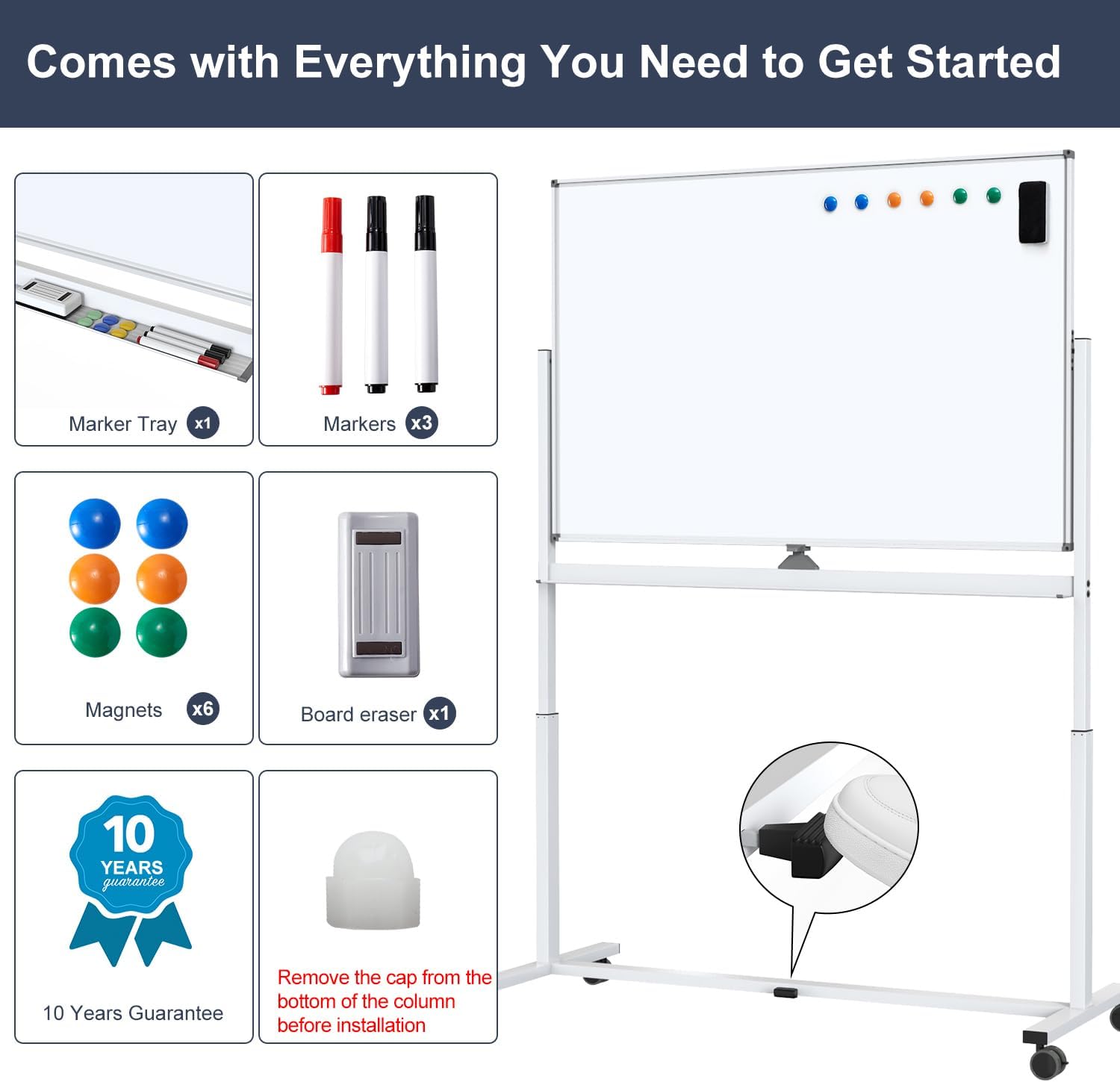 - INCLUDES EVERYTHING YOU NEED TO GET STARTED - This white board kit includes a big whiteboard, 3 markers, 6 magnets and 1 eraser. Enjoy the rolling white board as soon as you receive it.