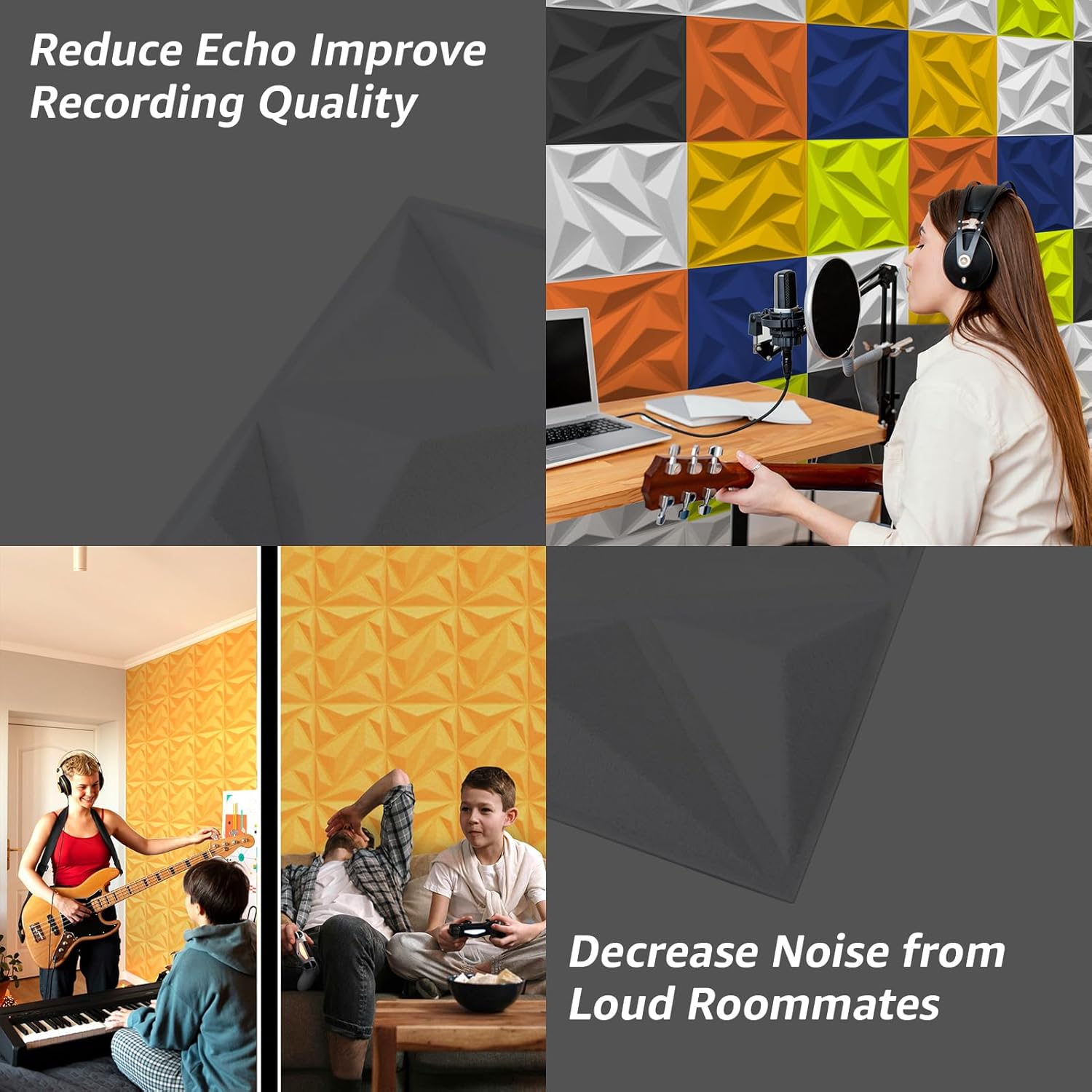 - Package Includes: 12" x 12" acoustic panels. Each box contains 20 tiles and double-sided tape.