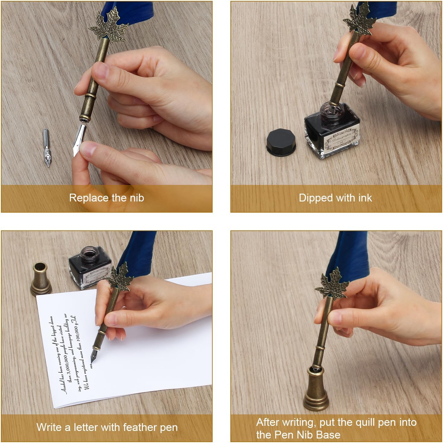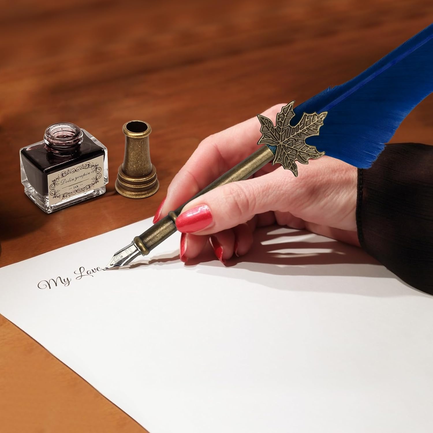 AHIER Quill Pen and Ink Set, Feather Pen Quill Pen Set Includes 5 Steel Replacement Nibs,Pen Nib Base and Dip Ink Bottle for Antique Calligraphy (Blue)