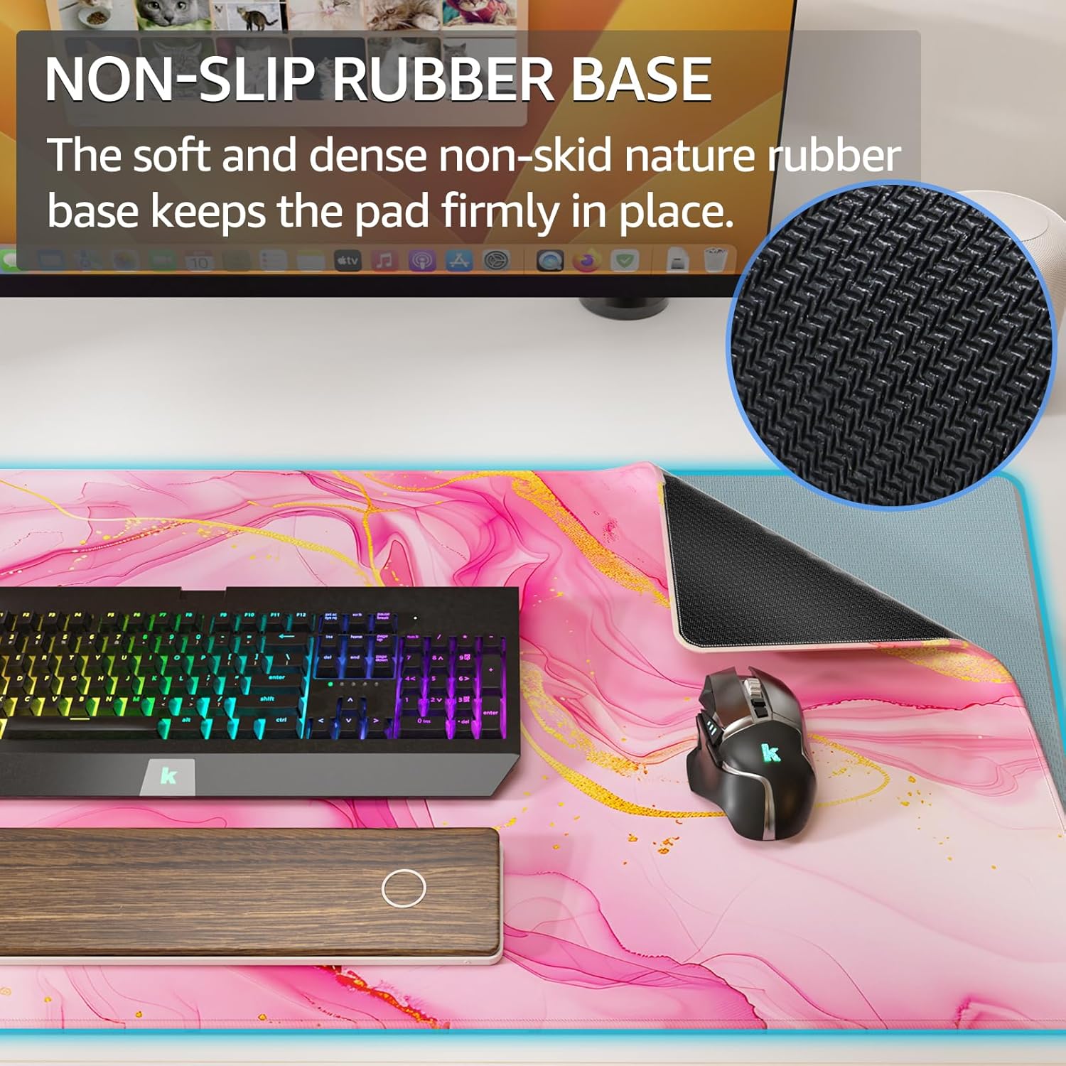 KTRIO Large Gaming Mouse Pad with Stitched Edges, Extended Mousepad with Superior Micro-Weave Cloth, Non-Slip Base, Water Resist Keyboard Pad for Gamer, Office & Home, 31.5x15.7in, Pink Marble