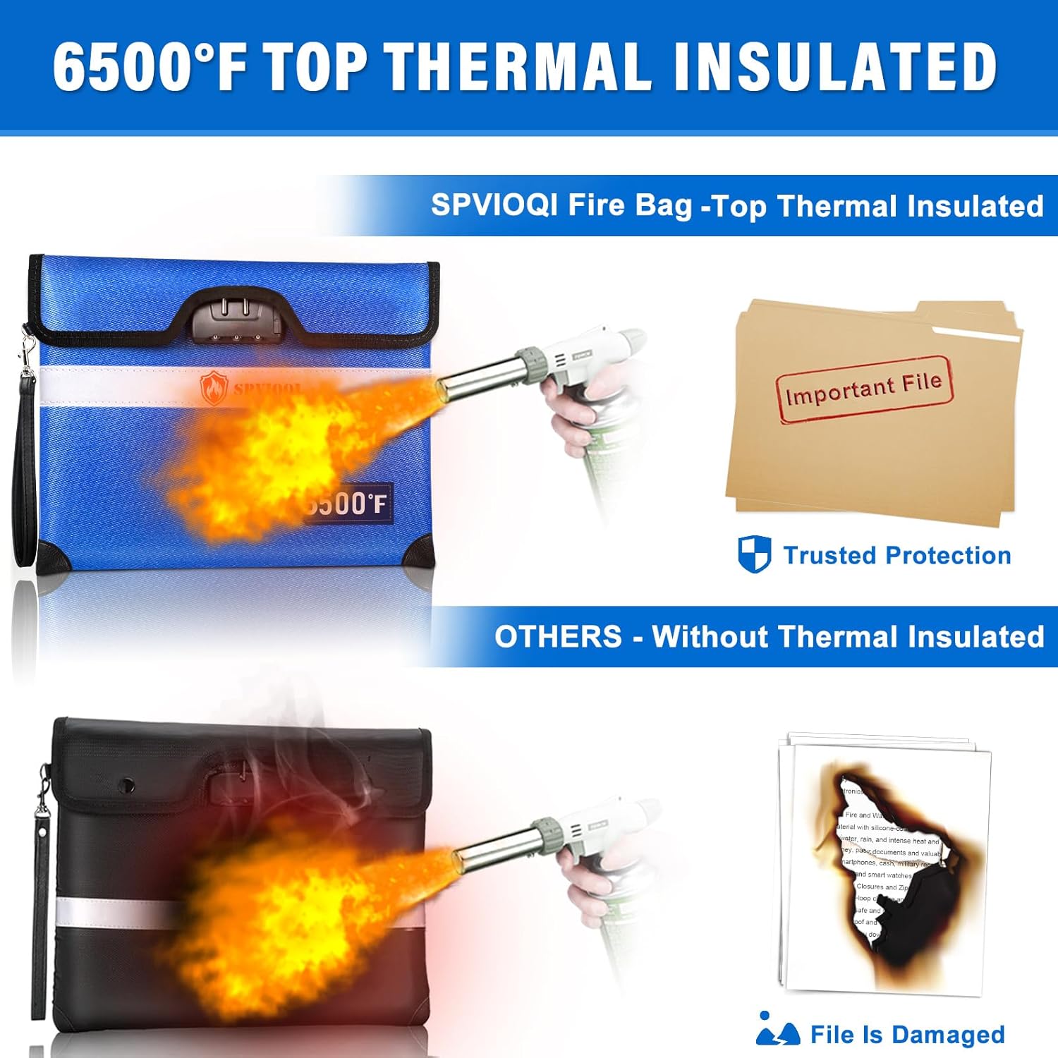 - 360° FIREPROOF DESIGN: This SPVIOQI fireproof document bag mainly adopt a 10-layer function material structure of fire protection and heat insulated; The fireproof money bag for cash is sewn with flame-retardant thread and fireproof hemming, to prevent fire from damaging the fireproof bag from the edge, closure by velcro flap, so that its zipper completely prevent fire, which make the fire proof money bag for cash 360° fire resistant