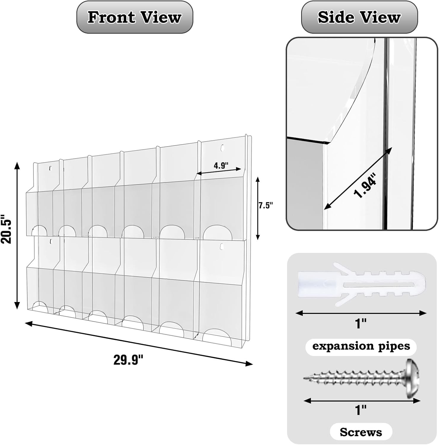 Acrylic Brochure Pamphlet Holder, 12 Pamphlet Holders, Clear Brochure Display Stand Wall Mount, Trifold Flyer Rack, Literature Storage Rack for Home, Offices, Waiting Room