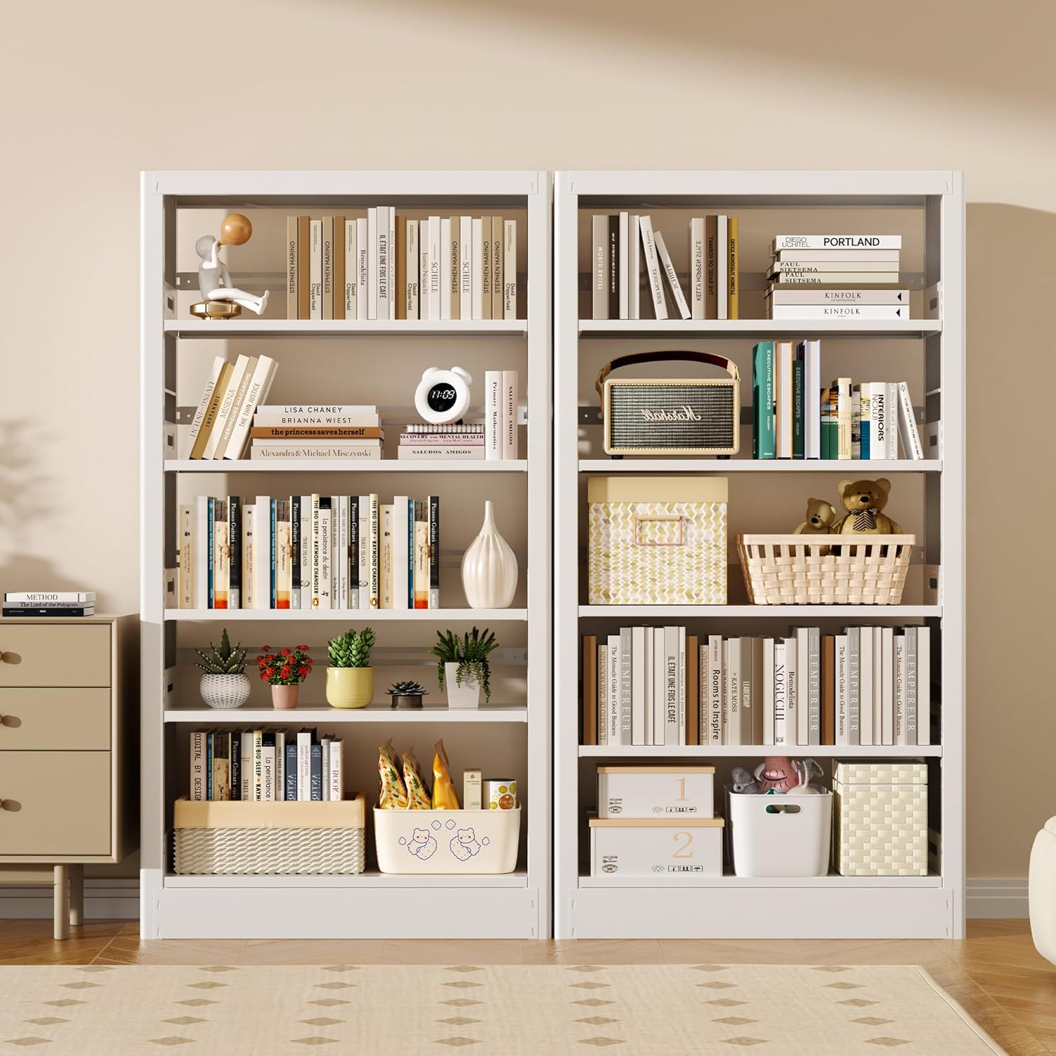 - FLOOR STANDING BOOKCASE WITH ADJUSTABLE SHELVES: This 5 tier bookshelf features a popular size of 11.8"D x 37.4"W x 70.9"H. The white bookshelf has a unique interlocking design that allows for easy shelf adjustment of easy shelf without the need for screws. You can change the height of the bookcase based on the size of your books and other items whenever necessary. This design not only simplifies assembly and adjustments but also enhances the versatility of the bookshelves. As a result, this adjustable bookshelf is suitable for use in a study, living room, office, or library