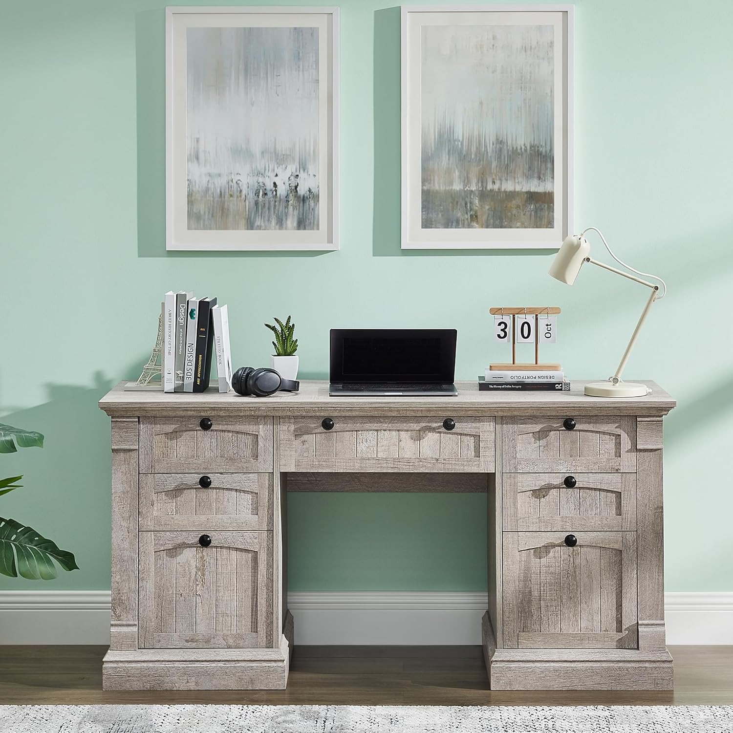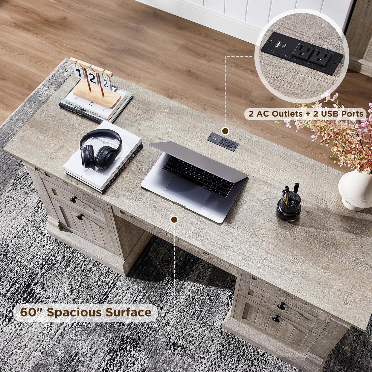 - Timeless Farmhouse Design: Crafted with a vintage-inspired farmhouse look, this OKD 60" executive desk blends charm and functionality to elevate your home office. With high-quality materials, a distressed finish, and thoughtful detailing, it complements a wide range of décor styles while offering lasting durability.