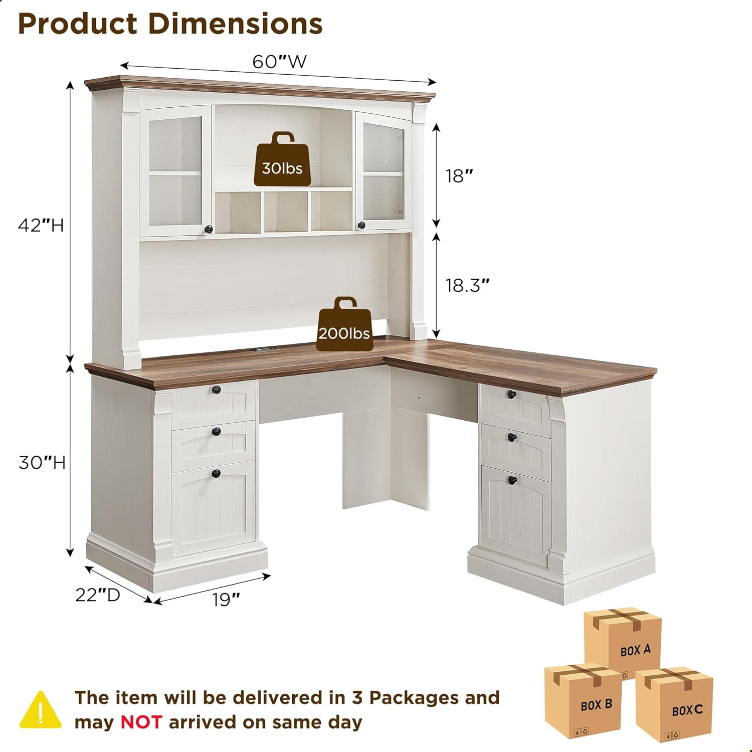 OKD 60" L Shaped Executive Desk with Hutch and Drawers, Farmhouse Home Office Desk with Charging Station, File Cabinet Storage, Wood Corner Computer Desk for Work and Study, Antique White