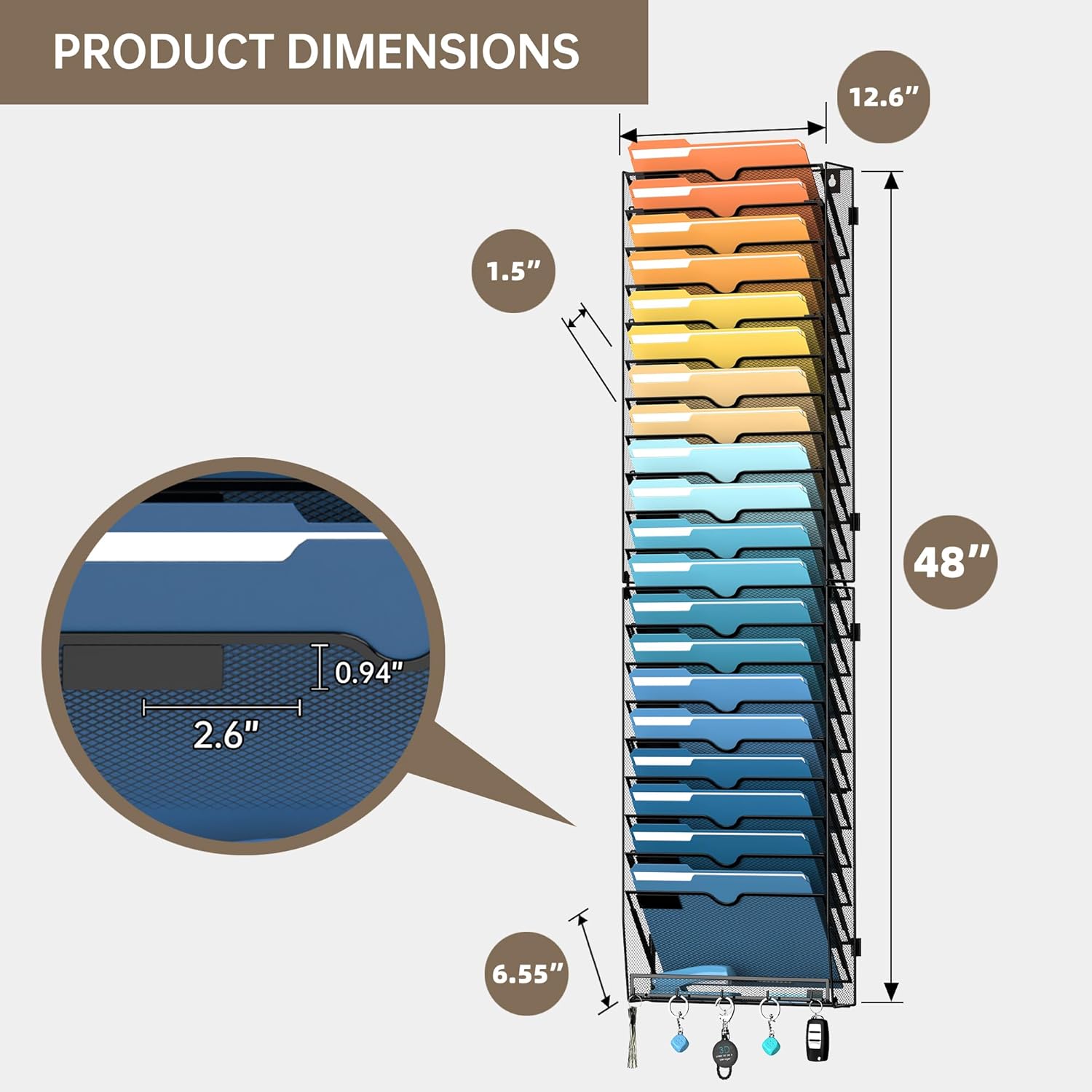 - [Quick & Easy Installation] Simplify your life with our wall file organizer solution! Installation is a breeze, requiring only a few screws. Quick, simple, and efficient - you'll be amazed at how easily you can transform your space.