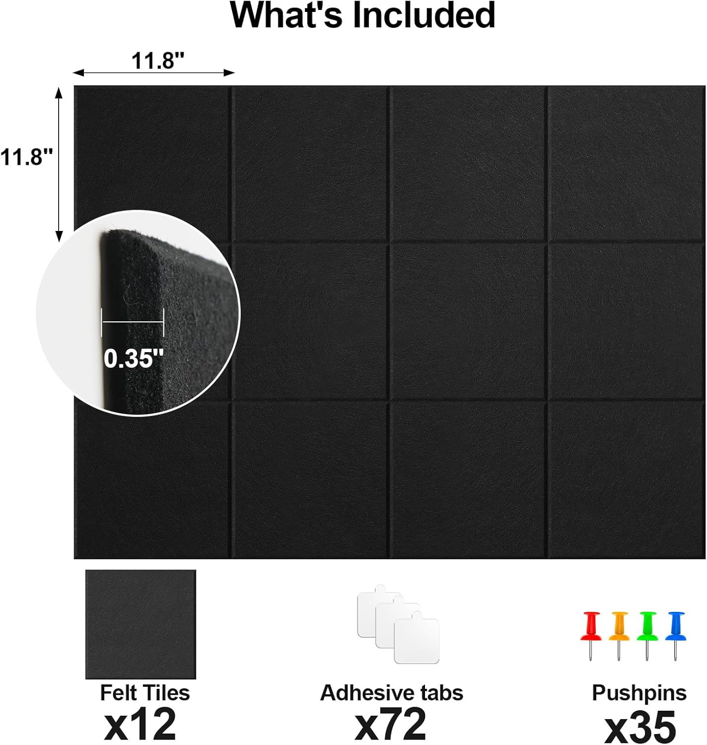 Large Cork Board for Walls 47" x 35" 12 Pack Black Bulletin Boards Felt Wall Tiles with Safe Removable Adhesive Corkboards for Office Home,Black