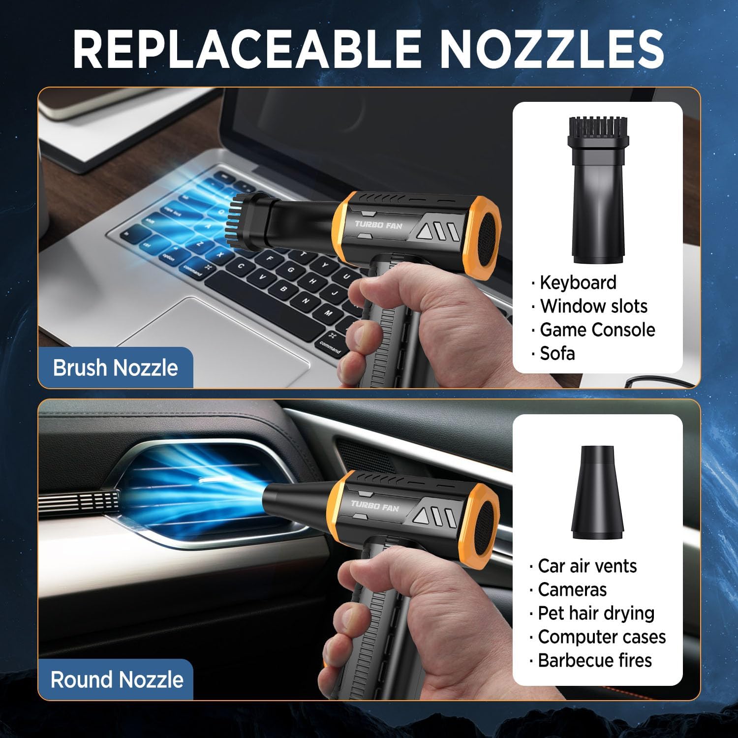 - 【Upgraded High-Capacity Battery & Fast Charging】 The rechargeable air dusters have built-in 10000mAh batteries, which provide enough power for long hours of use. These batteries are temperature, current, and short-circuit protected, so the fan air speed will not decrease even after prolonged use. At the same time, they support fast charging and have a Type-C connector, making them compatible with a variety of charging methods, including charging from a car or mobile power source.