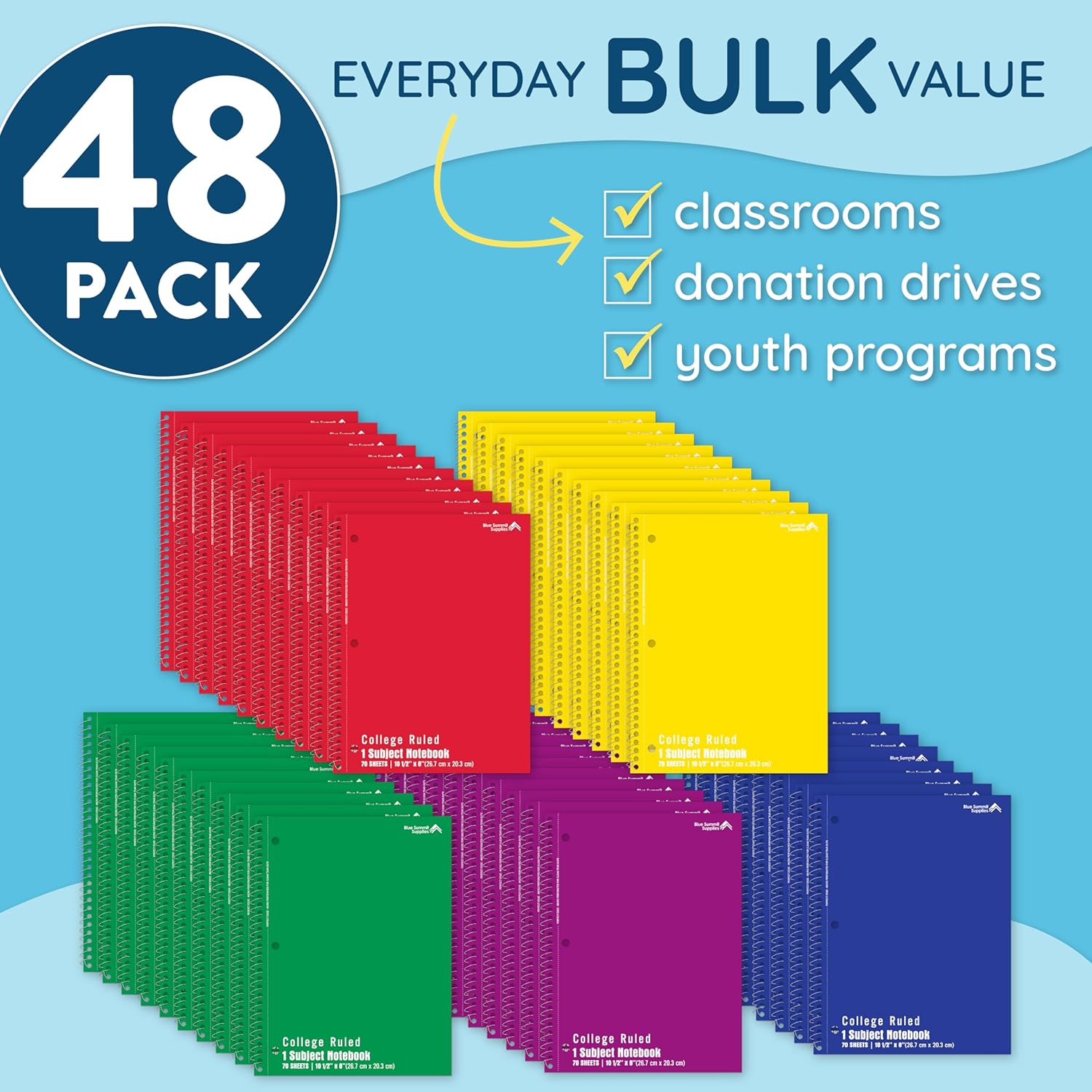 Blue Summit Spiral Notebooks Bulk, One Subject Spiral Notebook College Ruled, Perforated Notebook, 8 x 10.5 for Work and School, Paper, College Ruled, Bulk 48 Pack