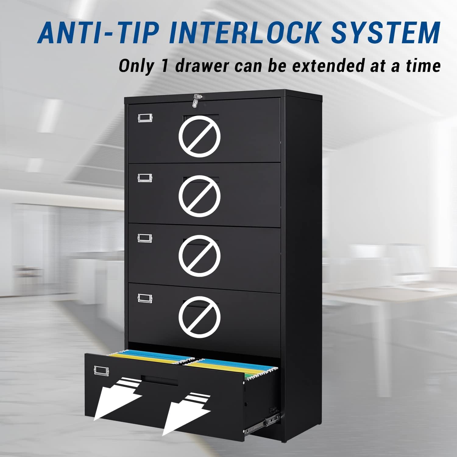 - ANTI-TILT DESIGN- When you fully open one drawer of this file cabinet, the other drawer cannot be opened. This is to prevent the drawer from storing too much paper and causing the cabinet to topple over.