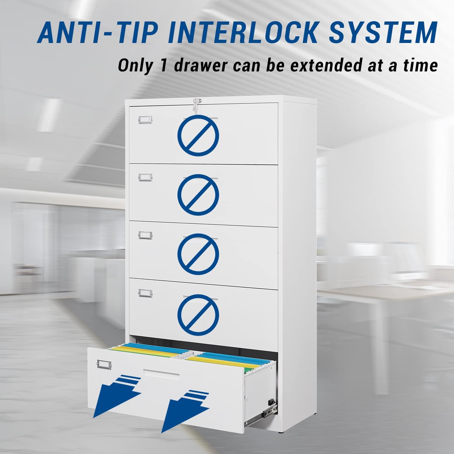 - ANTI-TILT DESIGN- When you fully open one drawer of this file cabinet, the other drawer cannot be opened. This is to prevent the drawer from storing too much paper and causing the cabinet to topple over.