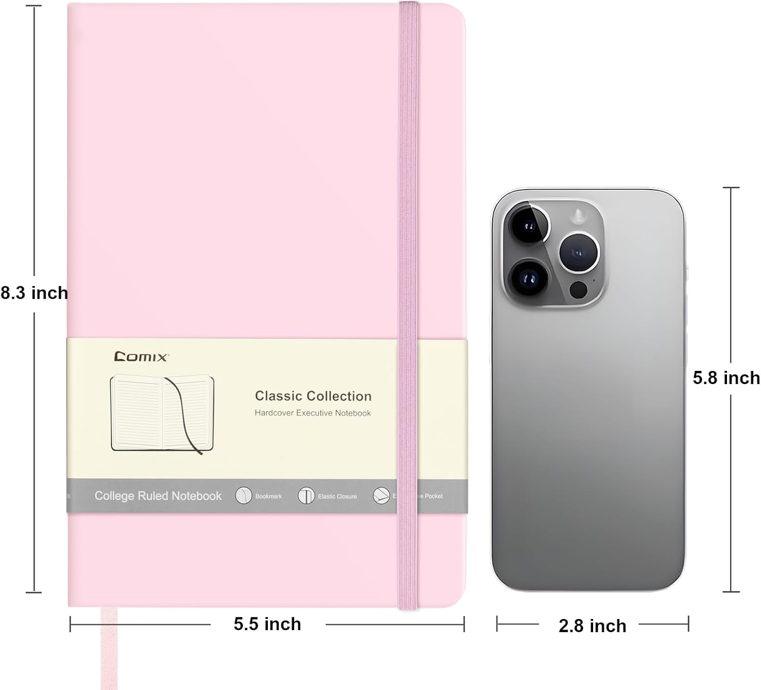 Comix Lined Journal Notebook for Women Men, Journaling Notebooks for Office School Home, Pink, 240 Pages, 5.5" x 8.3", College Ruled, A5, Hardcover