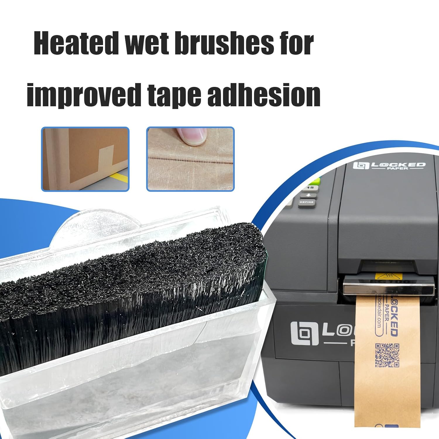 - Superb Adhesion and Tackiness: The water tape dispenser uses a unique brush with heatable bristles to evenly apply water to moisten the tape, and an intelligent temperature control chip that enables a stronger seal for warehouse storage and shipping box packages