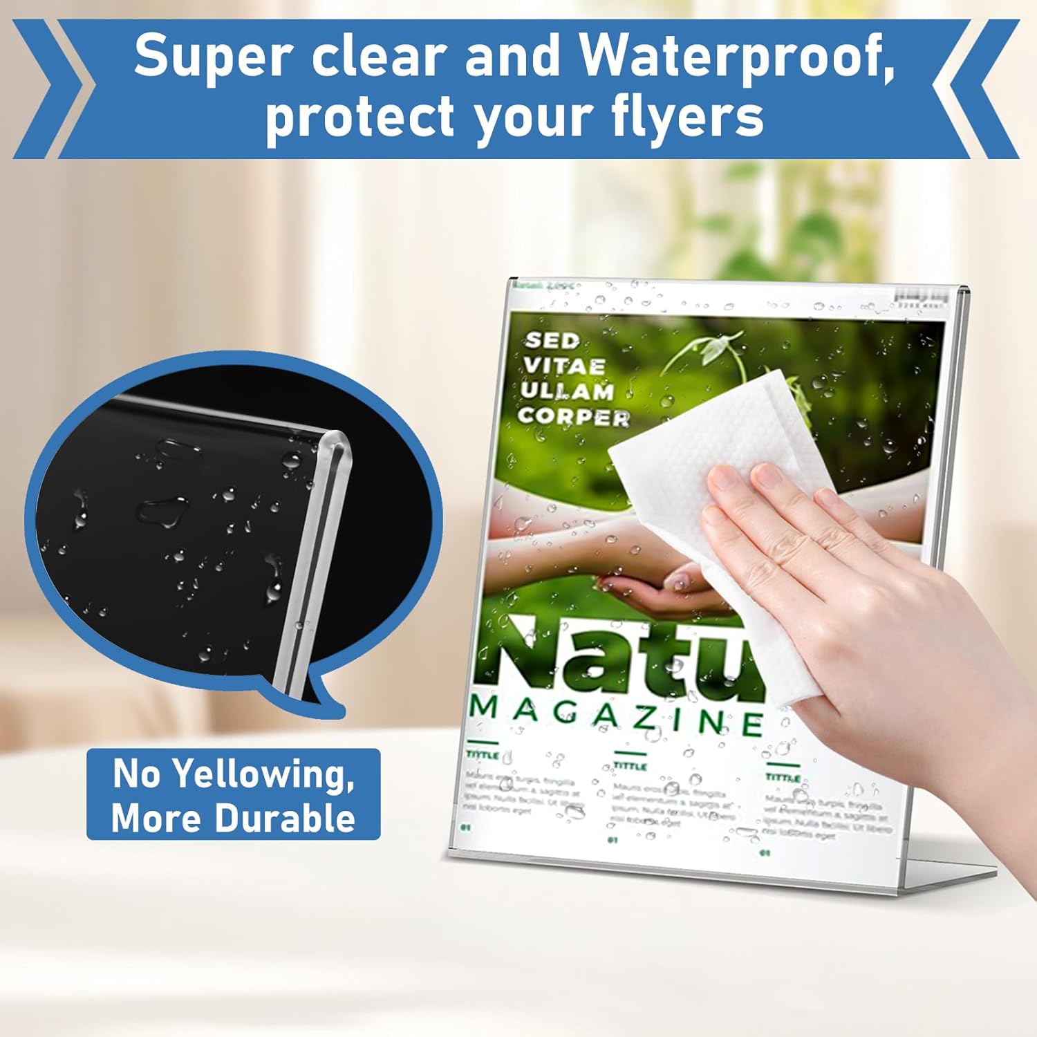 - 【Stable Slant Back Design】Our clear acrylic display stand is designed with slanted base. With this self-standing design, our Table Menu display stand Wide flat base allows free-standing vertical stable presentation of inserts, keeps the unit stable on counters, displaying images, desktops, and advertising pamphlets etc.