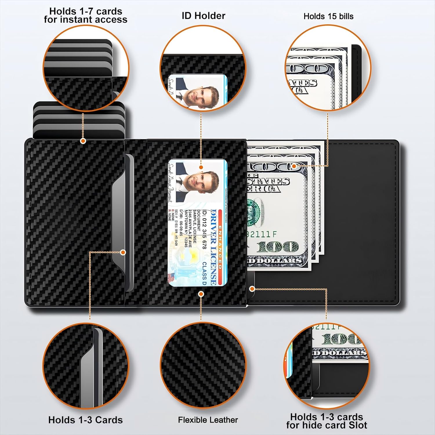 Mens Wallet Card Holder - Pop Up Aluminum Case, Flexible Carbon Fiber Leather, Smart Wallet for Men, RFID Blocking, Slim, Minimalist, Front Pocket - 9-14 Card Capacity | ID Window | Cash Slot