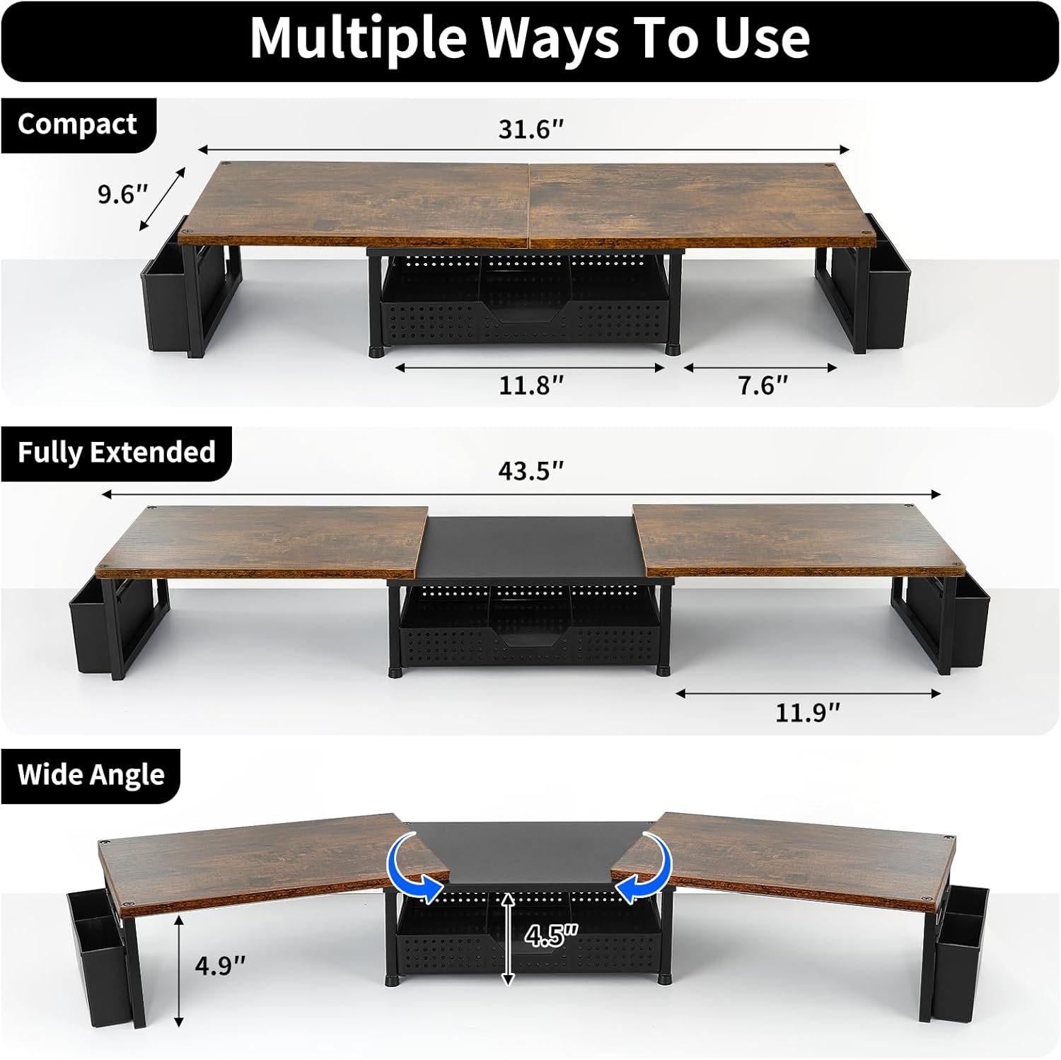 - More Storage Space: Space under the monitor stand can be used for additional desk supplies storage. A drawer tray + 2 pen holders can compartments size for different stationery. The dual monitor stand creating a clear workspace environment