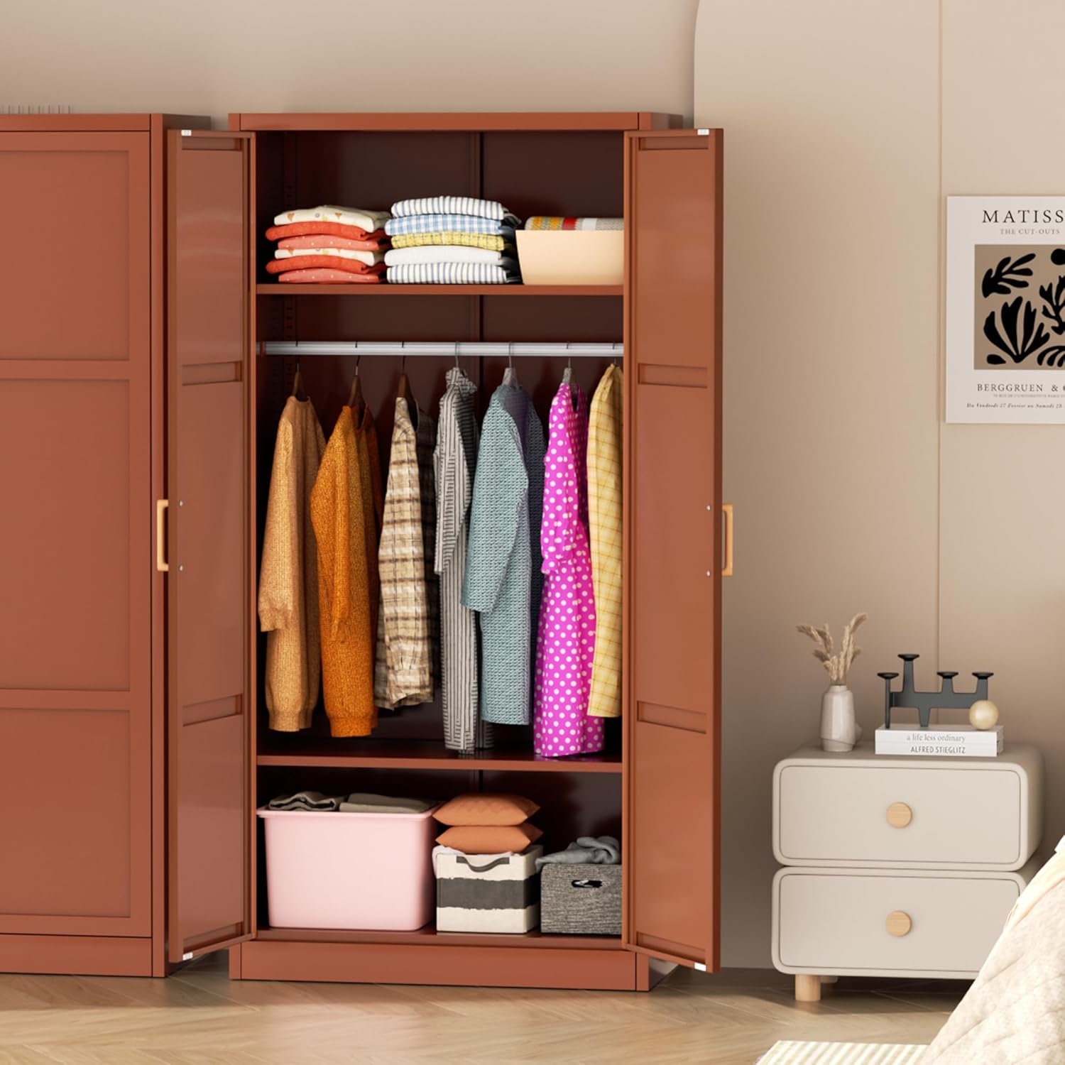 Greenvelly Metal Wardrobe Cabinet with Wooden Handle, 72" Metal Wardrobe Closet with Hanging Rods and Adjustable Shelves, Clothing Storage Closet Cabinet for Home, Office, Employee, Gym (Brown)