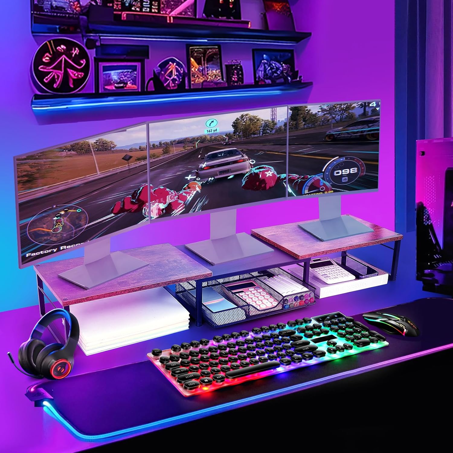 - More Storage Space: Space under the monitor stand can be used for additional desk supplies storage. A drawer tray can compartments size for different stationery. The desk monitor stand creating a clear workspace environment